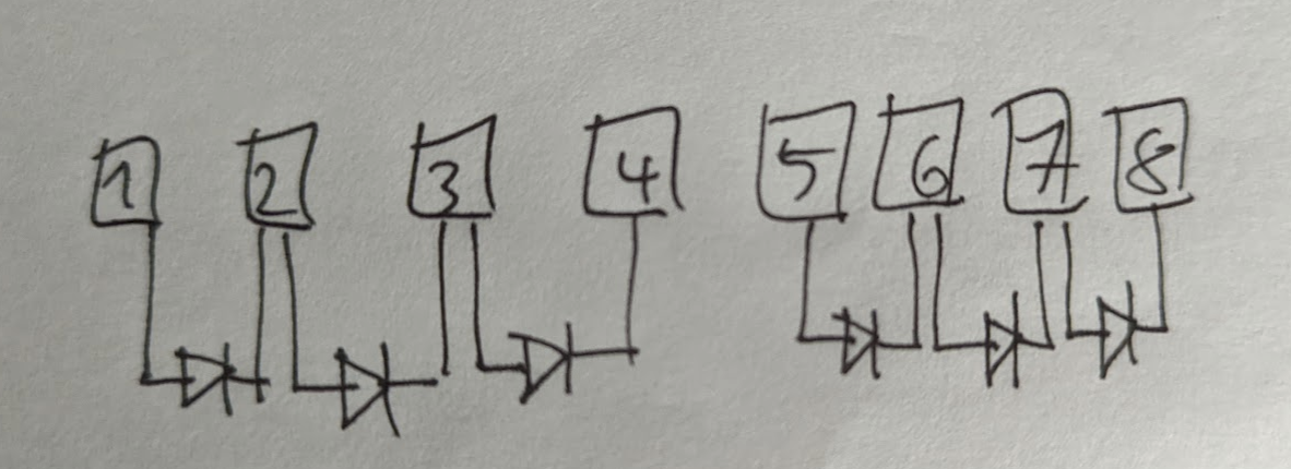Simplified schematic with 8 cells, needs only 6 LEDs to check every sensing wire. You do not need to check between (4,5), because if you did swap the wires, the LED now connected to (3,5) should see 8V and pop.