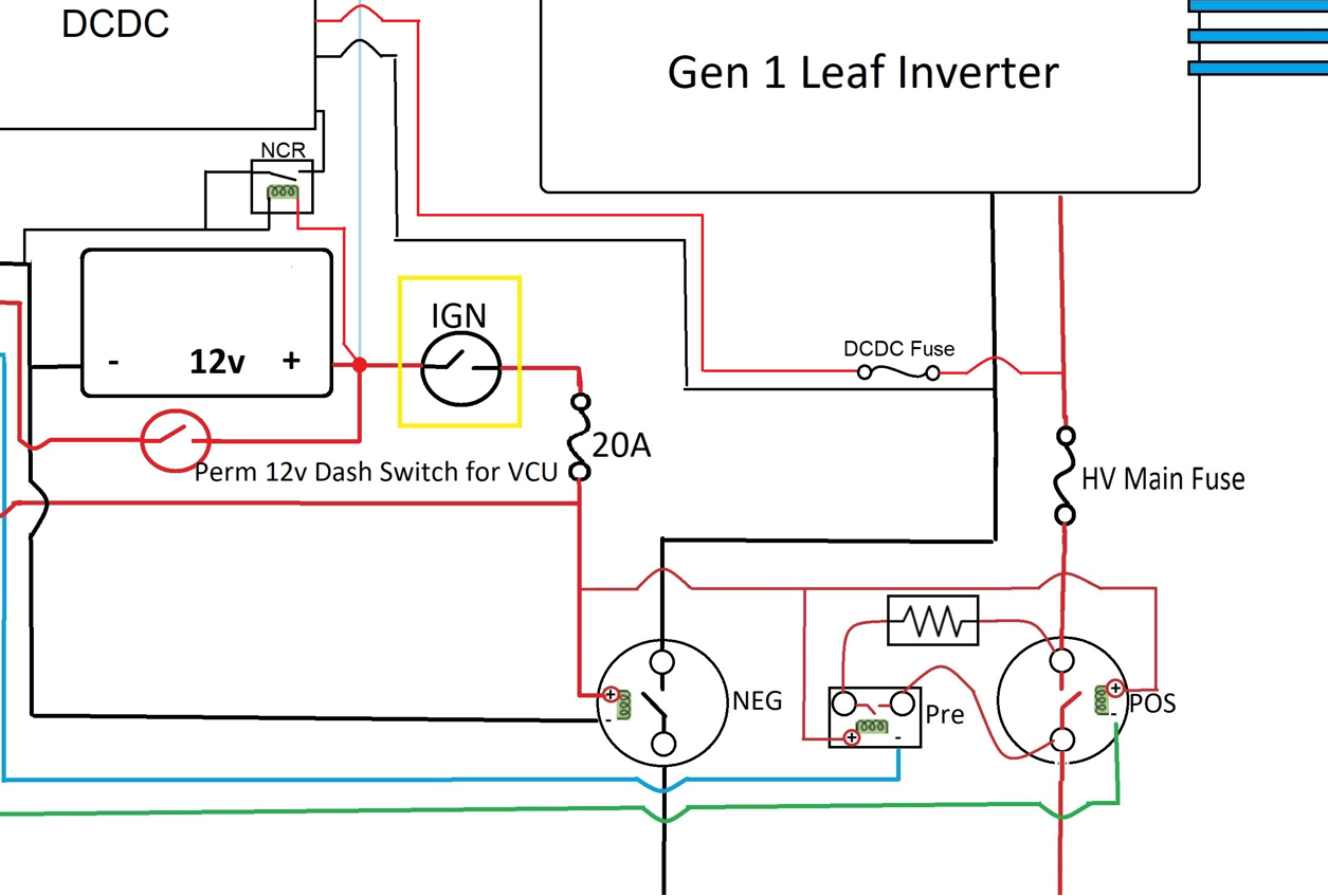 Here is my setup from when I got things set up first for ref. I would check that all your Leaf PDM wiring follows the layout Are you connecting this with the service disconnect out? That should be the last thing you put in place. I cant see why it is going 'live' at the point you are doing up the final HV fixings and the PCR is going pop. Something very wrong there. Are you using Damiens Leaf VCU? When it comes to timing as you mentioned, timing should only come into place with the settings you have in the VCU (Damiens or Johannes') and you trigger the Neg and Precharge contactors followed by the Pos main after you reach HV preset