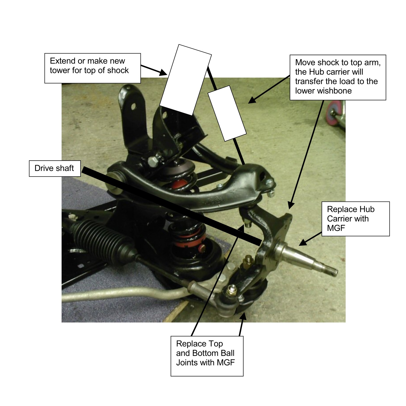 Then weld on thick washers on their on the top arm place to make ~10mm then use a taper reamer to take the MGF/MGTF upper ball joint.