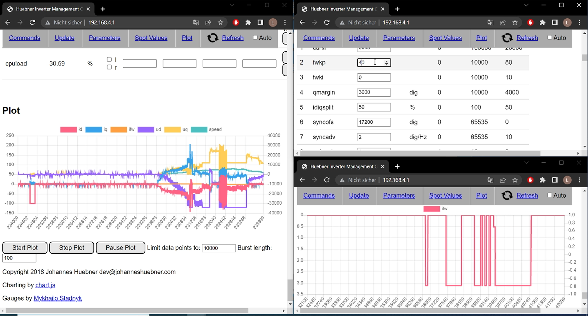 I tried again with idiqsplit down to 20% and fwkp up to 400. There is no change in the behavior, ifw still maxes out at 4 and everything is oscillating heavily. fwki=0 for all tests, as even in standstill any value above 0 causes some rattling in the motor. Below are examples with fwkp=100 and fwkp=400. Notice that I have a quite high curkp, so even without FW there is some oscillation of the PI output values, id and iq. I have spent quite some time trying to get curkp lower, but there are always unwanted effects (self-acceleration, torque oscillations, ..) associated with that.
