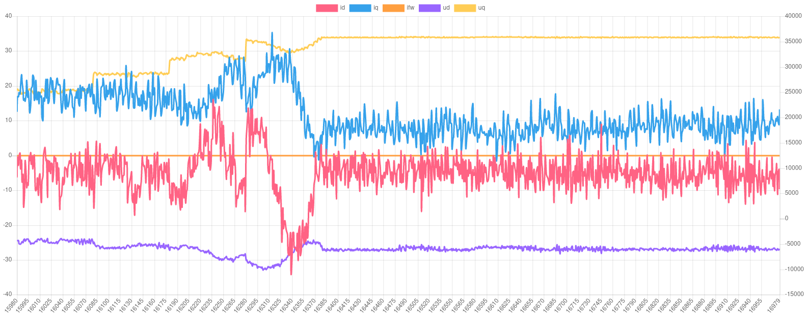 Below is the plot recorded during self-acceleration due to FW. ud is maxed out but uq is not. It rather looks like it has a new minimum value that it can’t fall below.