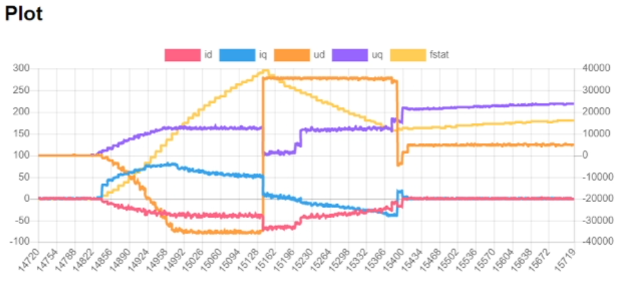 The optimal values for fwIdMax and fwIqMax, the currents that are added at higher rpms, vary heavily with syncadv but are in the range of 30-80A. I got fwIdStart at 300 (the frequency at which the additional currents are linearly ramped up) and fwIdEnd at 600 (here they reach their Max value).