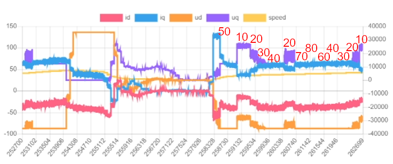 Furthermore, I did some idiqsplit testing: Field weakening was turned off (fwkp/ki=0) and I started with syncadv=0. For a wide idiqsplit range (30 to 80), I cannot feel a difference between different values and overall it feels equal/ slightly worse to MTPA. Again, ud seems to be a limiting factor as it maxes out quickly. Below is a plot of a test run at full throttle and different idiqsplit values (red numbers are the idiqsplit values at that interval):
