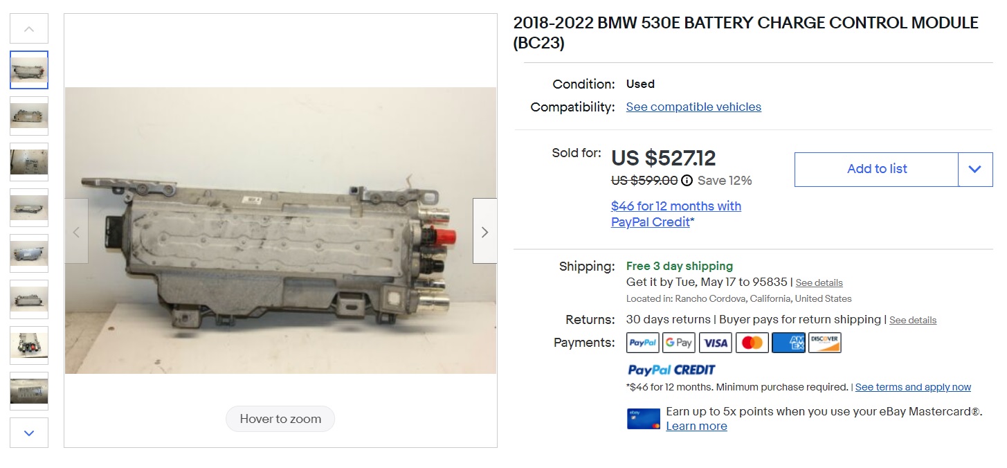 so it started out innocent enuff, another overpriced eBay listing for a 2018 BMW 530e "battery charge control module" ok, oh this one is local, from a wrecker in my town (helps to live in a town with one of the world's largest wrecking yards, but I digress) and free shipping, but hey I could pick it up, maybe chat them up for additional parts, I know I'll low ball 'em and forget all about it - um how about $300 ? Offer Sent