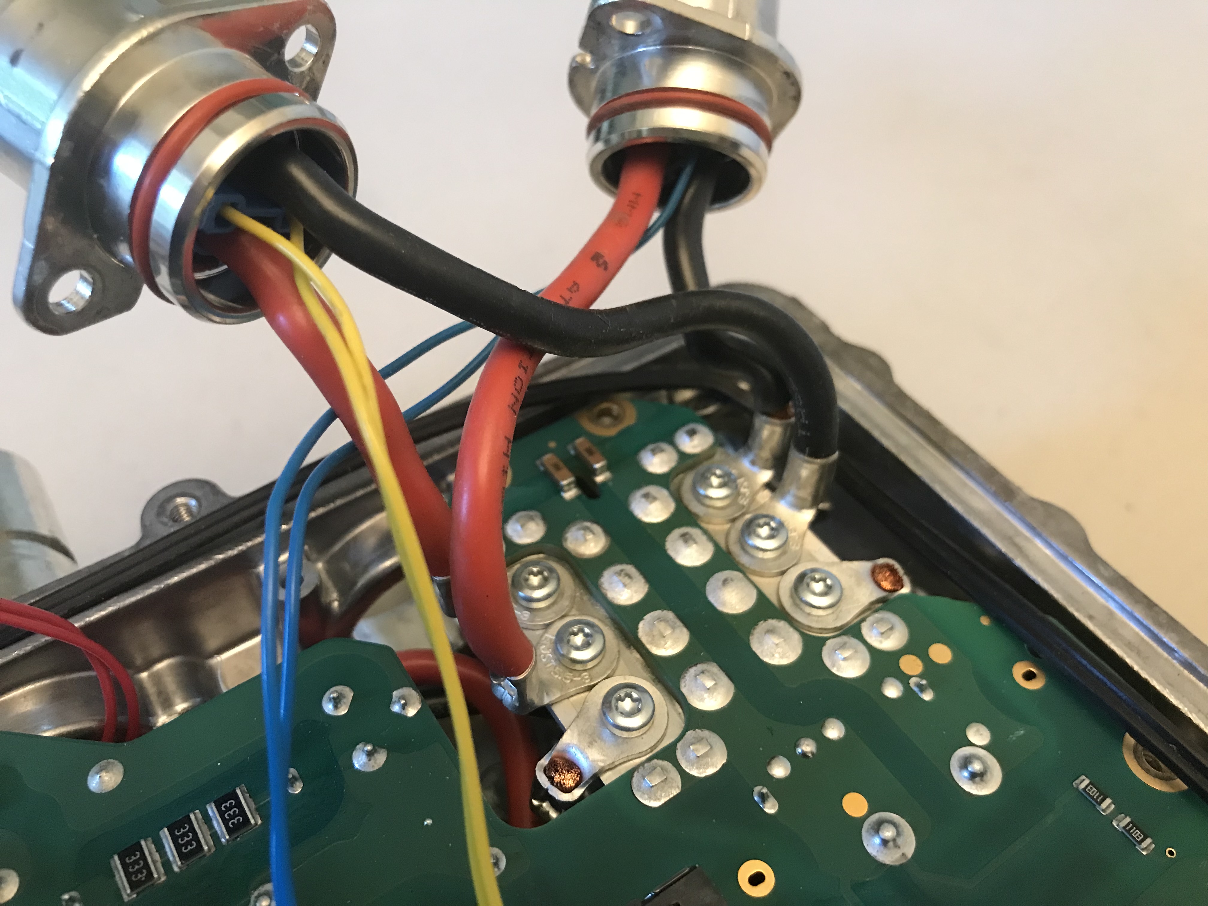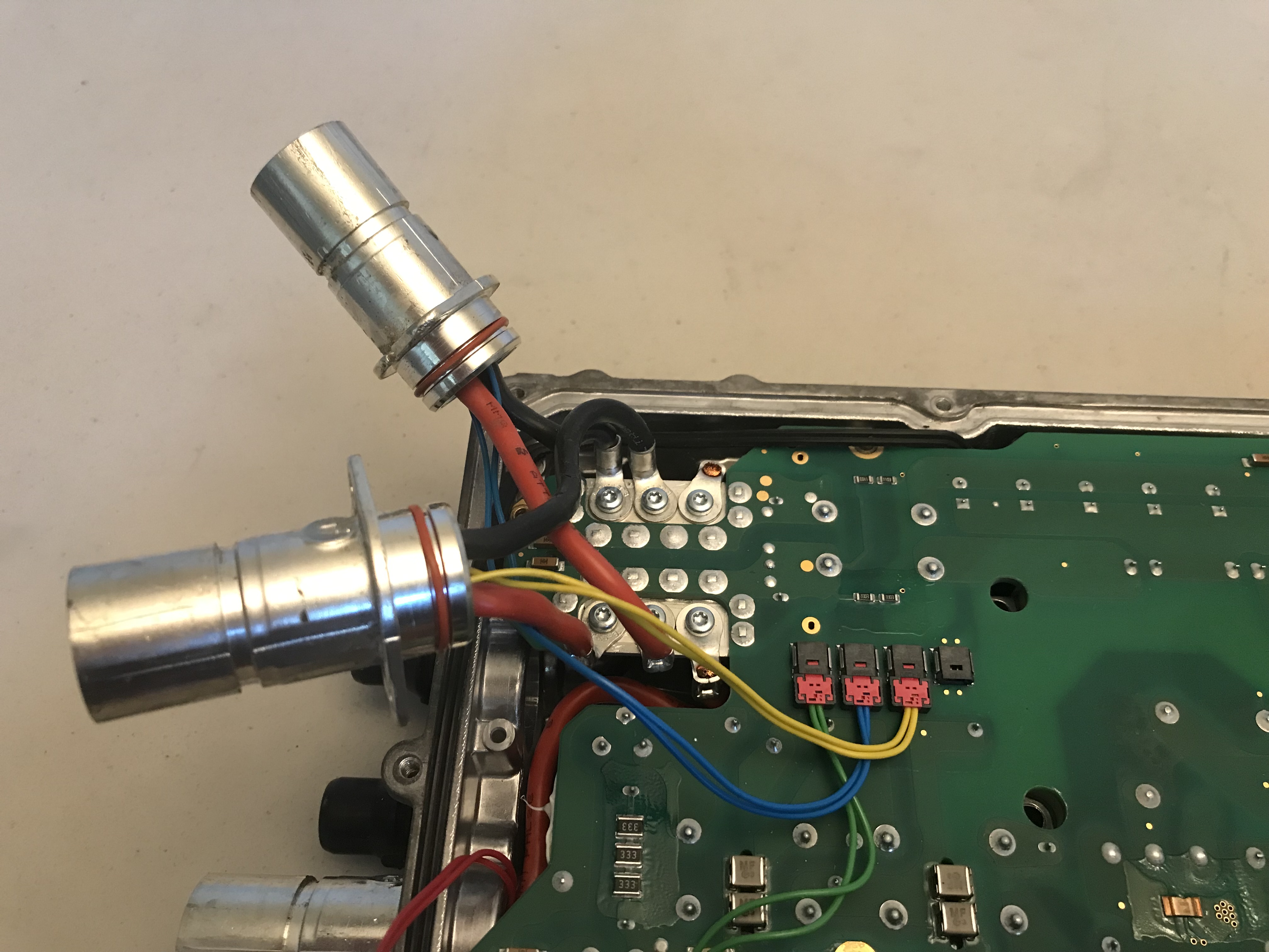 I just had to know where those tubular connectors run to, so I think this first one is actually the AC input plug that runs to the charging port socket, I rerouted it for demonstration purposes, at least in the end it's just a ring terminal connection, so that can easily be replaced with a regular high voltage orange cable, but what are those green thin wires for?