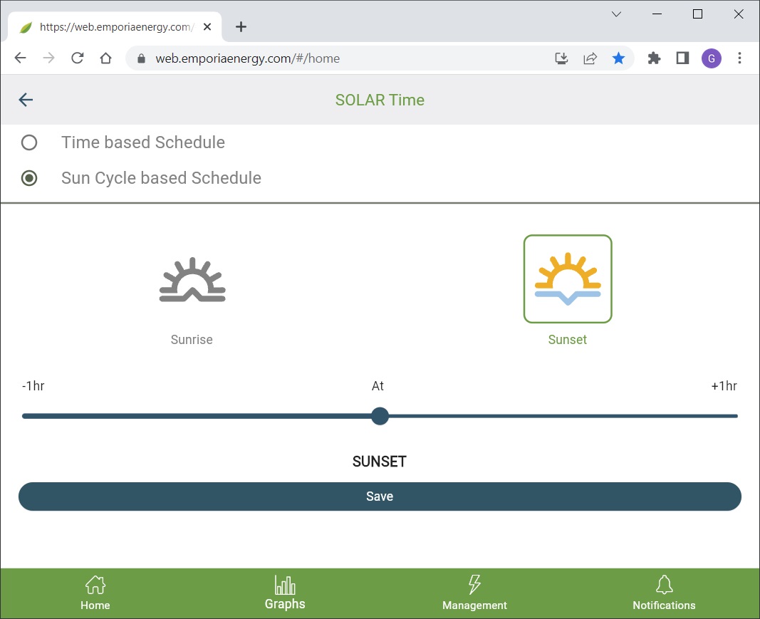 this next option blew my mind, the Emporia smart plug is not only integrated with my electrical company ie SMUD but it also knows my geographical location and therefor can operate based on ... [wait for it] the Sun Cycle