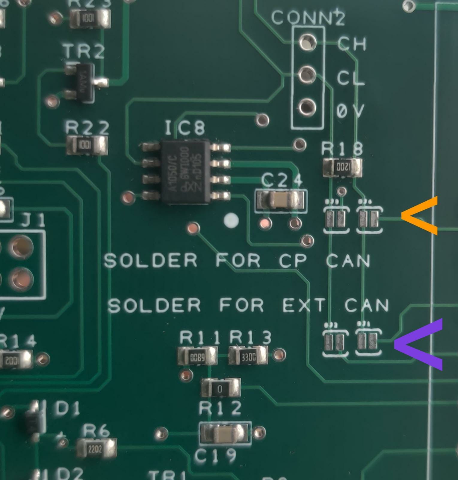 EXT CAN was soldered on 1st board, CP CAN was not soldered, upon further investigation noted the following: pins 34 & 35 for CP CAN are not used