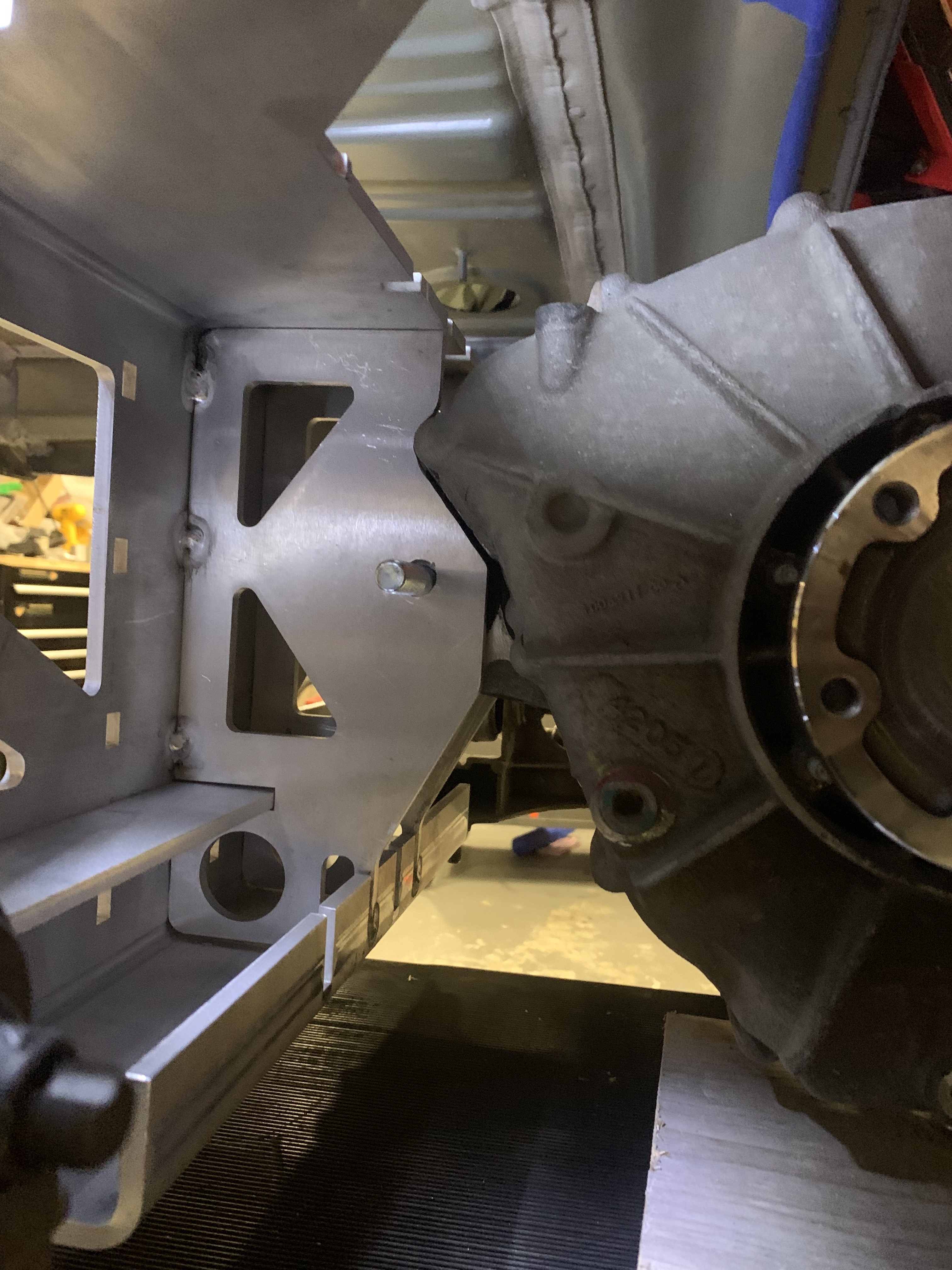 Off of this cross brace, another structure will be built to mount the motor on its front mount, and then extend down and be triangulated as I need to restore some bracing to the rear subframe from the removal of the factory stamped steel cross-brace.