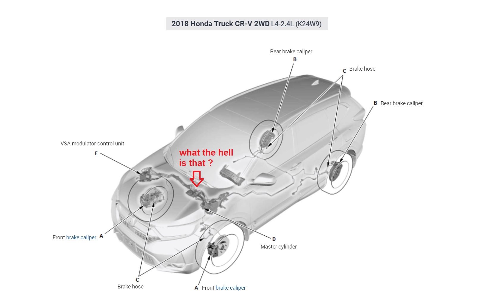 it looks as though the VSA modulator is what I was calling the abs modulator. your mystery component looks to be some kind of junction block where the 4 lines coming off of the VSA modulator split off and go to their specific wheels. Ill have to go out and look at my Clarity to see if I have one of those. it may be a packaging requirement on the CRV that is not really necessary. its possible that there is a separate abs solenoid apart from the VSA modulator that handles the abs functions. though i was under the impression that the VSA module handles both ABS and VSA functions