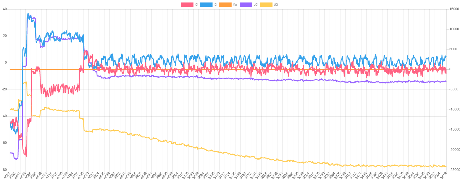 Been thinking a bit more about this and the best plot for checking the interaction of uq, ud, iq and id would be one showing them, plus frq, while coasting (no regen, no throttle, target of 0A for id and iq) down from just below base frequency.