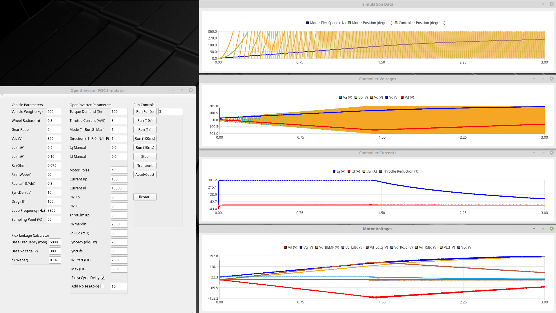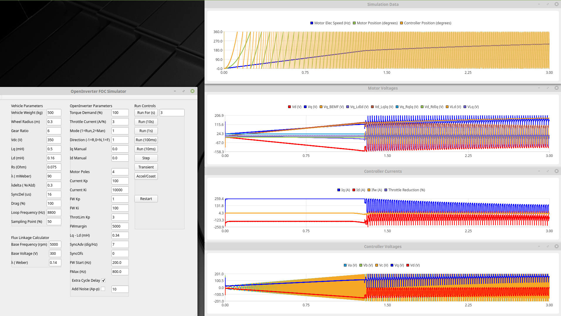 The following plots are with the revised simulator which uses the full motor model. It is using the low I values of 500uH and 160uH for motor Ld and Lq. The motor currents plot is replaced by one showing the voltages in the motor model. Also worth noting that throttle limiting is disabled for these.