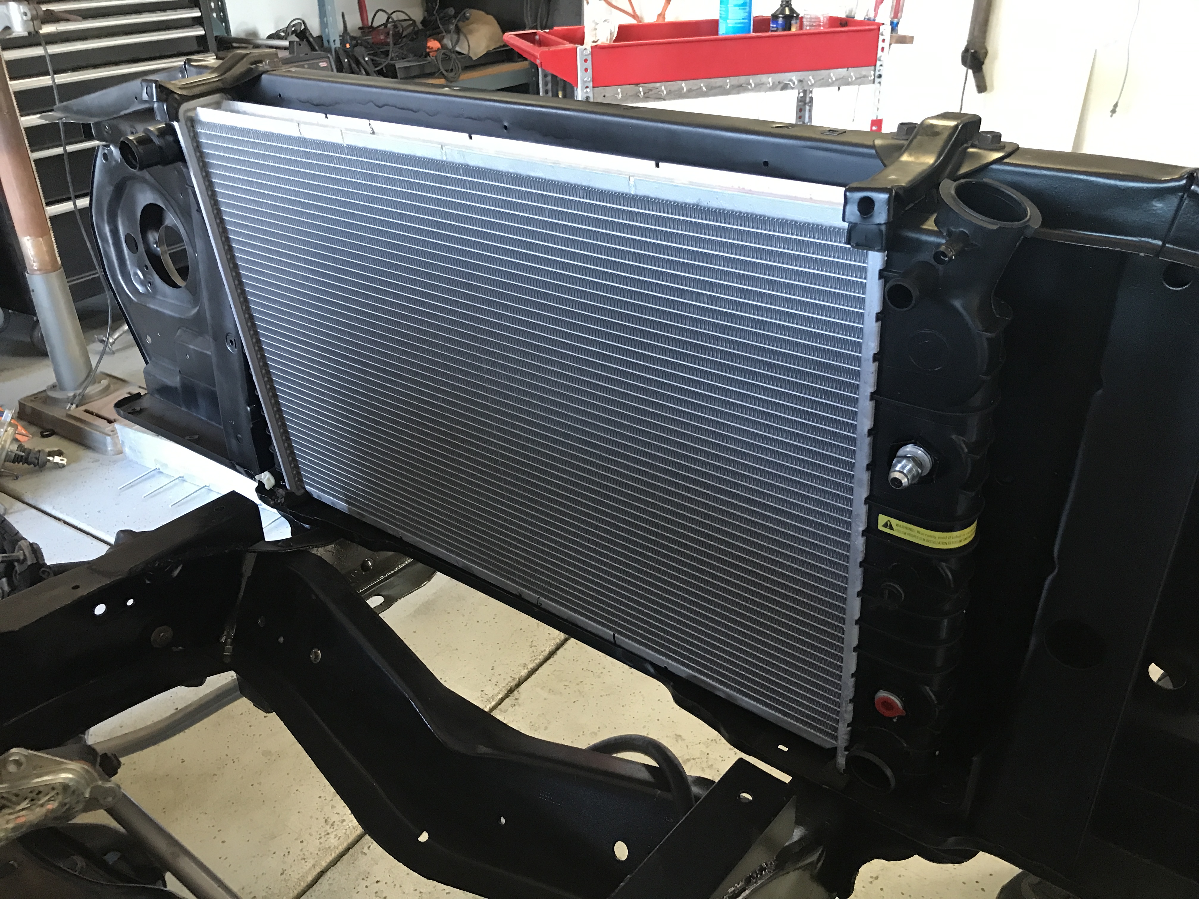 so I decided to replace that radiator with a brand new one, this solved one problem and helped with another, first I went down to a single core cause the old one was to thick being a dual core and never fit perfectly on the bottom and we just can't have that here at Good Enuff Garage
