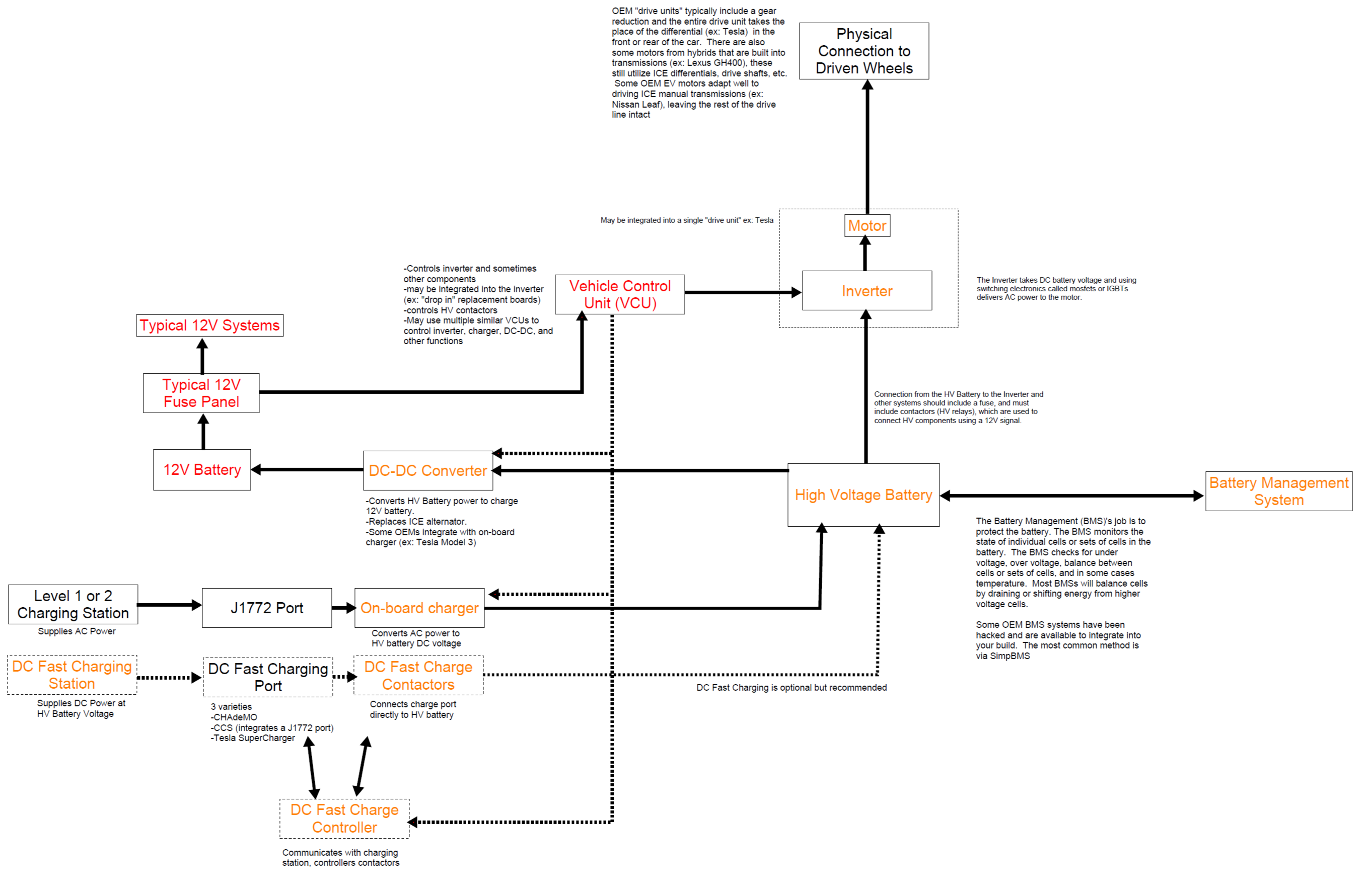 Ok so I have a first pass at two different options and I'd like folks' opinions. These are just quick screen grabs, the final version for the wiki will be a bit cleaner and use bigger fonts.P.S.Mangelsdorf wrote: ↑Thu Dec 15, 2022 12:56 pm I'm a visual guy, so I'm going to try to find time to draw up a high level diagram of all components needed for an EV conversion, I think it'd be useful for newbies to wrap their head around what is required. I make no promises - work has been insane - but I'll try.