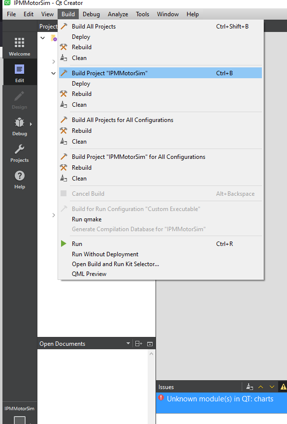To build the software go to 'Build' at the top and select 'Rebuild Project: IPMMotorSim'