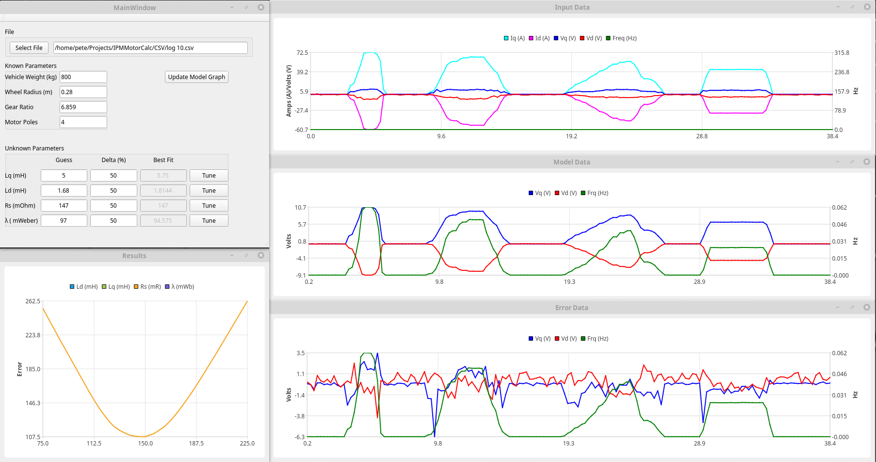 This runs the data through the model with varying values for the parameter ranging from Delta % below the nominal value to the same above while plotting the resulting error. The Lq, Ld and Flux Linkage plots clearly show and error minima which corresponds to the best fit between the measured and modelled data (this is also shown in the 'Best Fit' fields). The Rs plot is fairly useless as its effect is obviously below the noise floor - not sure whether to move it out of the tuning section. Similarly the vehicle data has very little effect at the moment (not really surprising as the way I ended up doing it doesn't allow time for vehicle inertia to have an impact) - not sure whether to remove it or leave it in case it is useful in the future.