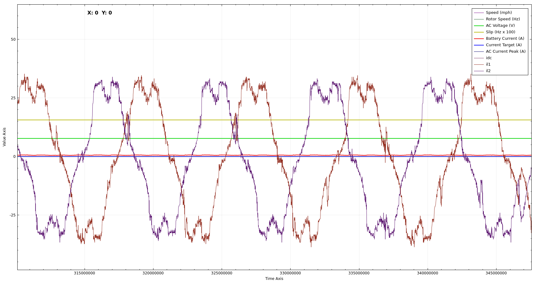 Today I added automatic field weakening. Essentially all this does is when voltage runs out and there is still a demand for additional torque, it increases maximum slip up to a defined limit When current no demand no longer exceeds current, it steps it back down again. Here's a 0-60 with fslipmax=3 and fslipweak=4: