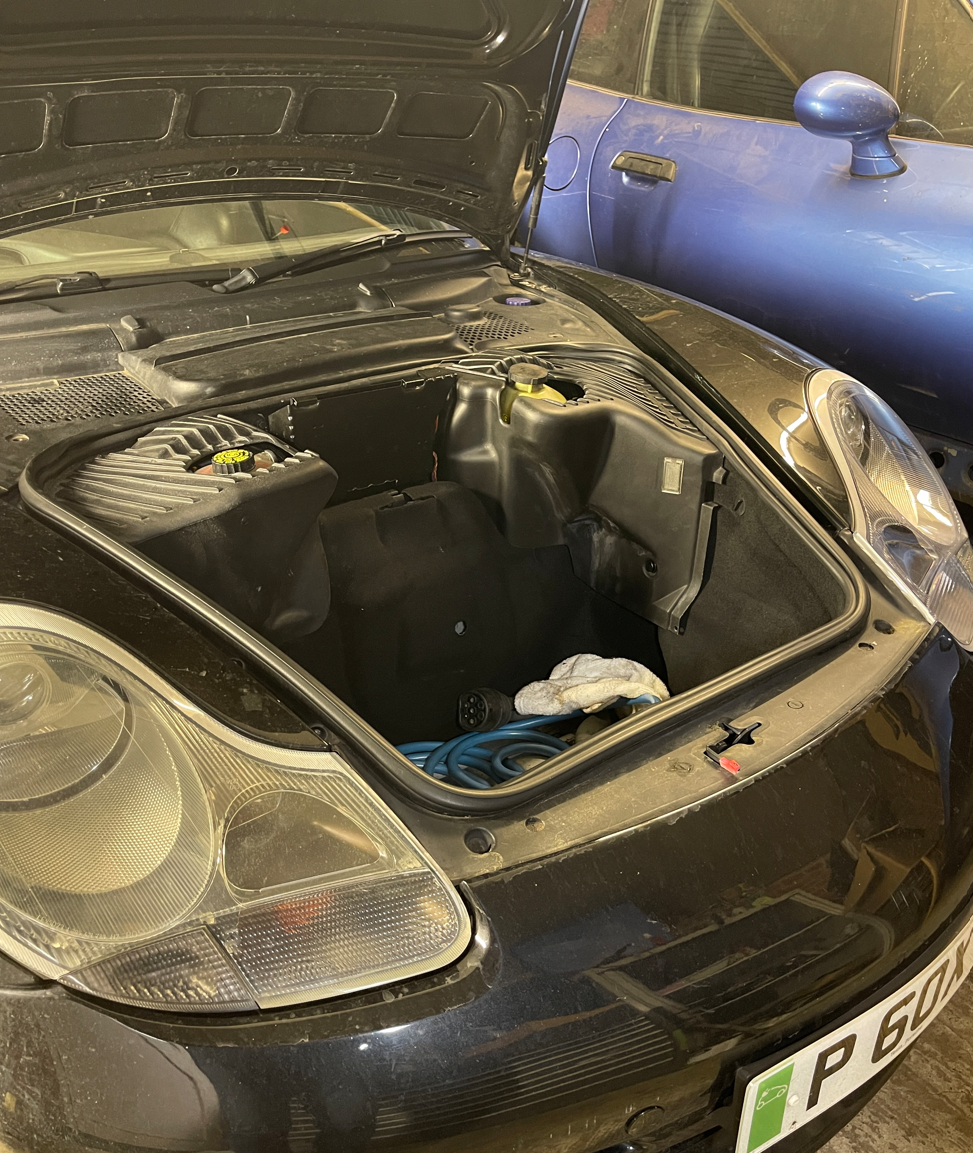 1) There is a perfect size niche towards the rear of the Porsche 996 911 and 986 Boxster tub (RWD cars only) for the Tesla charger to fit, meaning the actual usable space that’s consumed by the charger is small