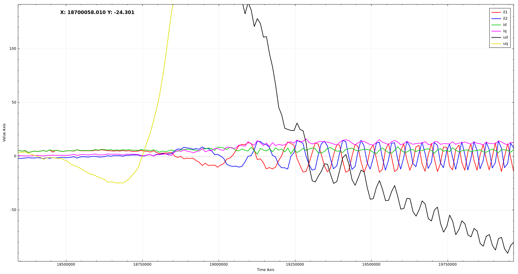 Next we run a Park and Clarke transform using the last known rotor field angle to derive the Id and Iq currents.