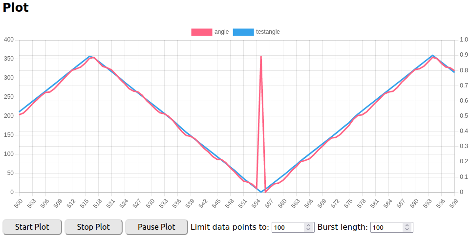 The motor should turn slowly and on plotting 'angle' and 'testangle' something like this should be seen: