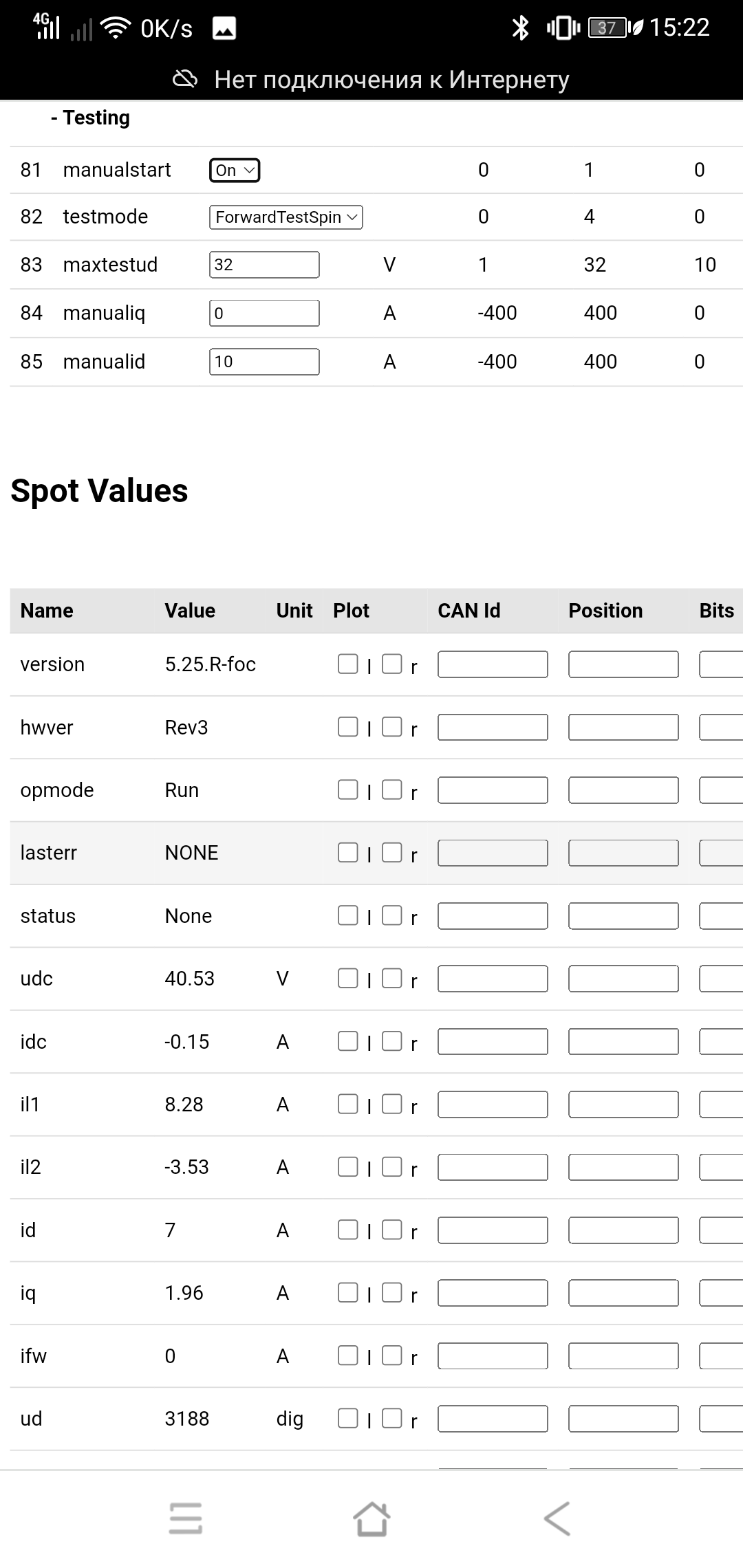 As mentioned before this code uses udc to estimate the initial PWM levels and so udc should be calibrated before using test mode. If using the test spin modes the curkp and curki parameters need to be set to sensible values too.