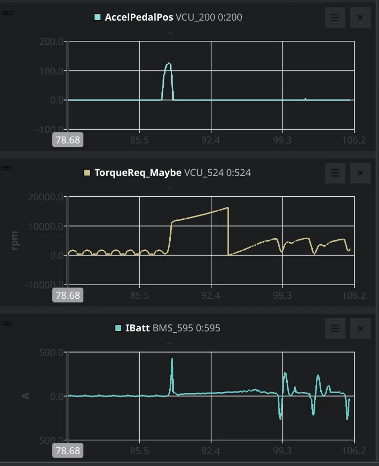 (Graph shows: A short accelerator pedal press and release, the VCU torque request starts climbing linearly, and then eventually it goes into some other state that coincides with relatively big battery transient currents.)