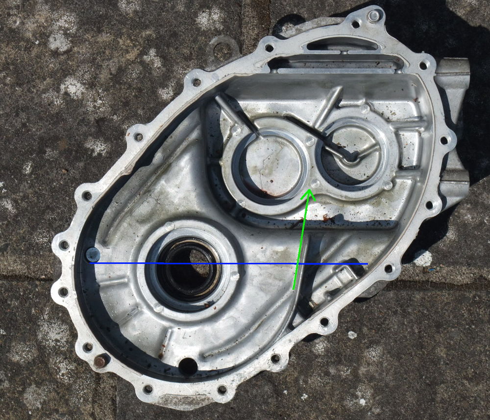 Again, proposed oil level shown (filled though old drain plug with old fill plug becoming the drain - not ideal positions but good enough). Because the motor is still spinning in the normal direction this maintains the old spray lubrication for the gears (green arrow). I'm a little concerned that some of the bearing oil drain channels also cast in are now facing the wrong direction but am reasonably comfortable that there will still be enough oil getting to all the bearings especially given that the intermediate gear is now partially in the oil.