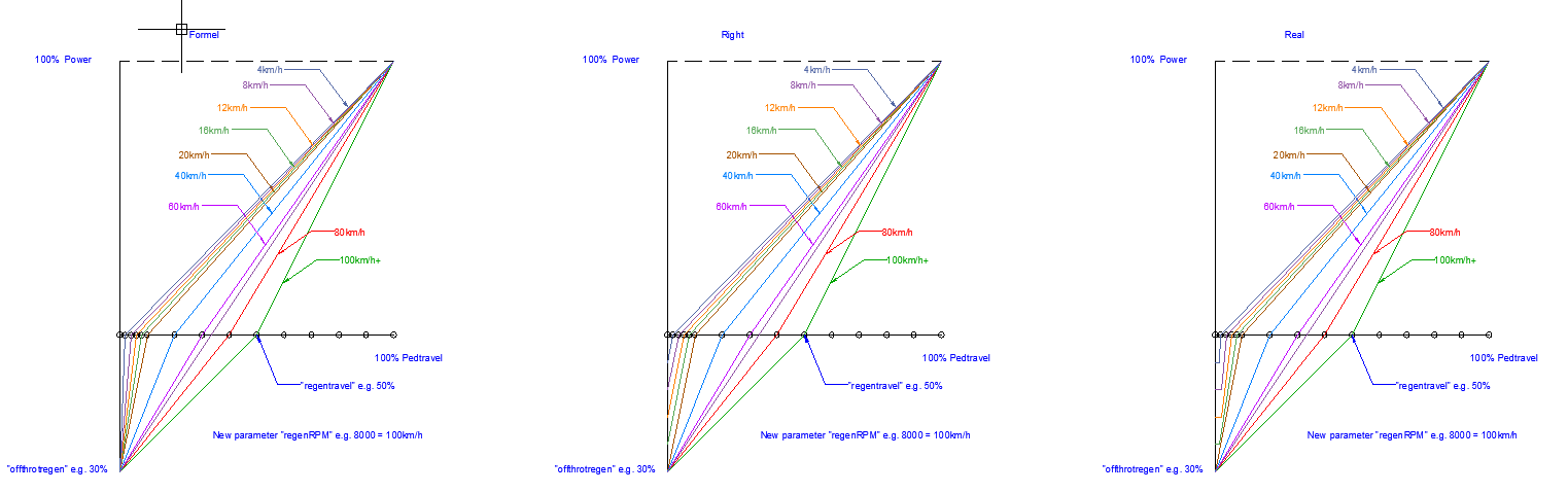 My suggestion looks like this. With a flat curve for acceleration at low speeds. Useful for high power configurations. Strong regeneration also possible at lower speeds => less use of the brake pedal. A new parameter needed, if it is set to 0 everything is as before. And of course no dead zone!