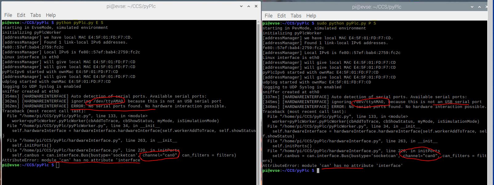 Hi @woleg not sure if I understood your response. But as you can see in the snapshot of the 2 consoles above, I've started the 2 sides EVSE and PEV in simulated modes with the arguments E S and P S respectively. Also from the first line of execution of the command the process says running in simulated mode. Hence I couldn't understand your response. I'll read thru the code and see if there's a way to disable these checks, I could also fake the interface if needed but didn't understand why they would be needed if simulating both sides to go thru the comm messaging. Appreciate you taking the time to go over.