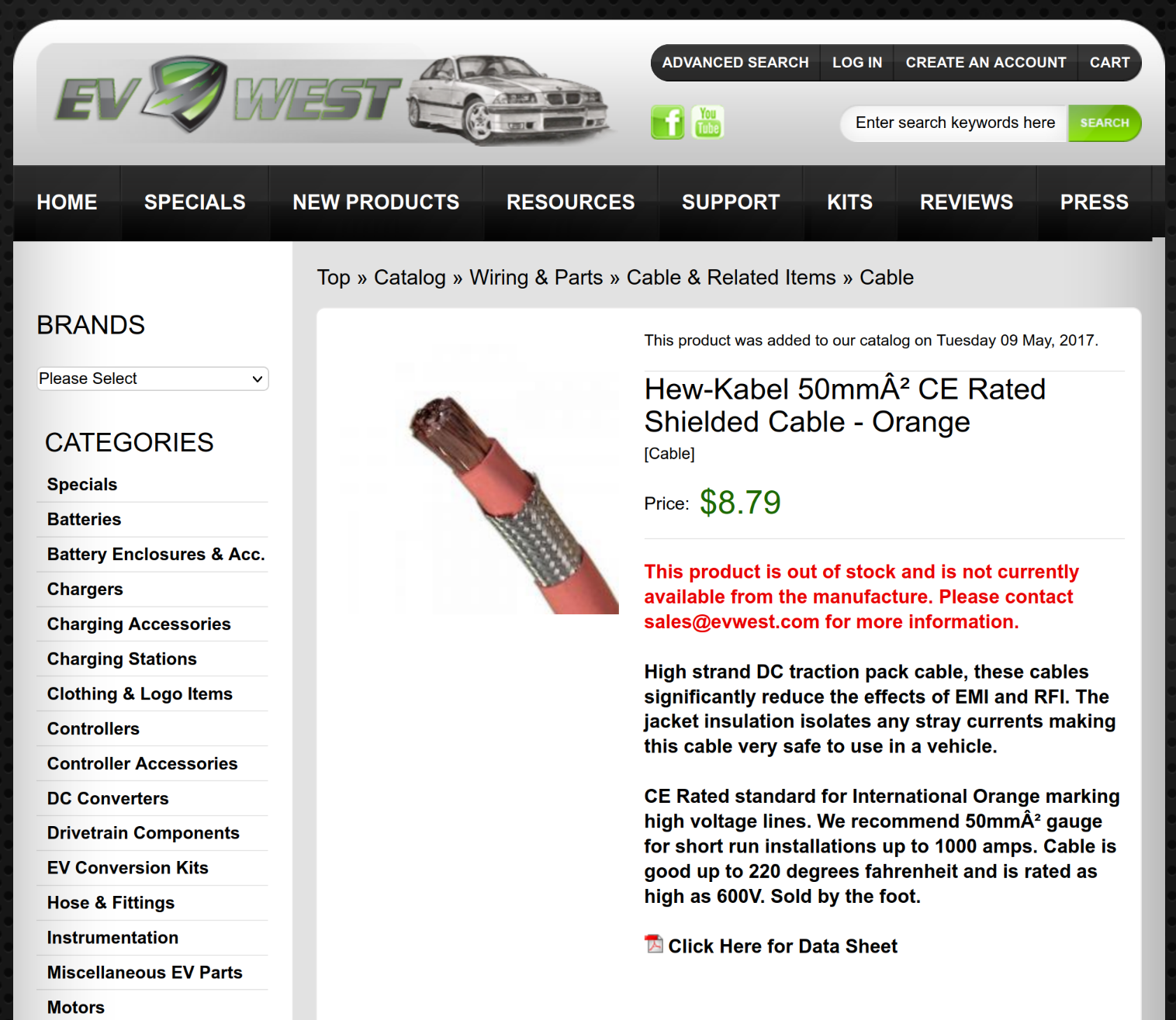 asavage wrote: Sat Jul 15, 2023 4:54 am I'm in the US, and I'm having trouble finding a supplier for 50mm2 shielded cable in orange with a 600v rating.