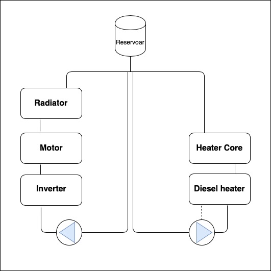 For the first two, it's necessary to have two cooling loops. I don't want to heat the coolant for the motors using a PTC heater, and nor do I want to pass my PTC-heated coolant through a radiator (as that would cool it down again).