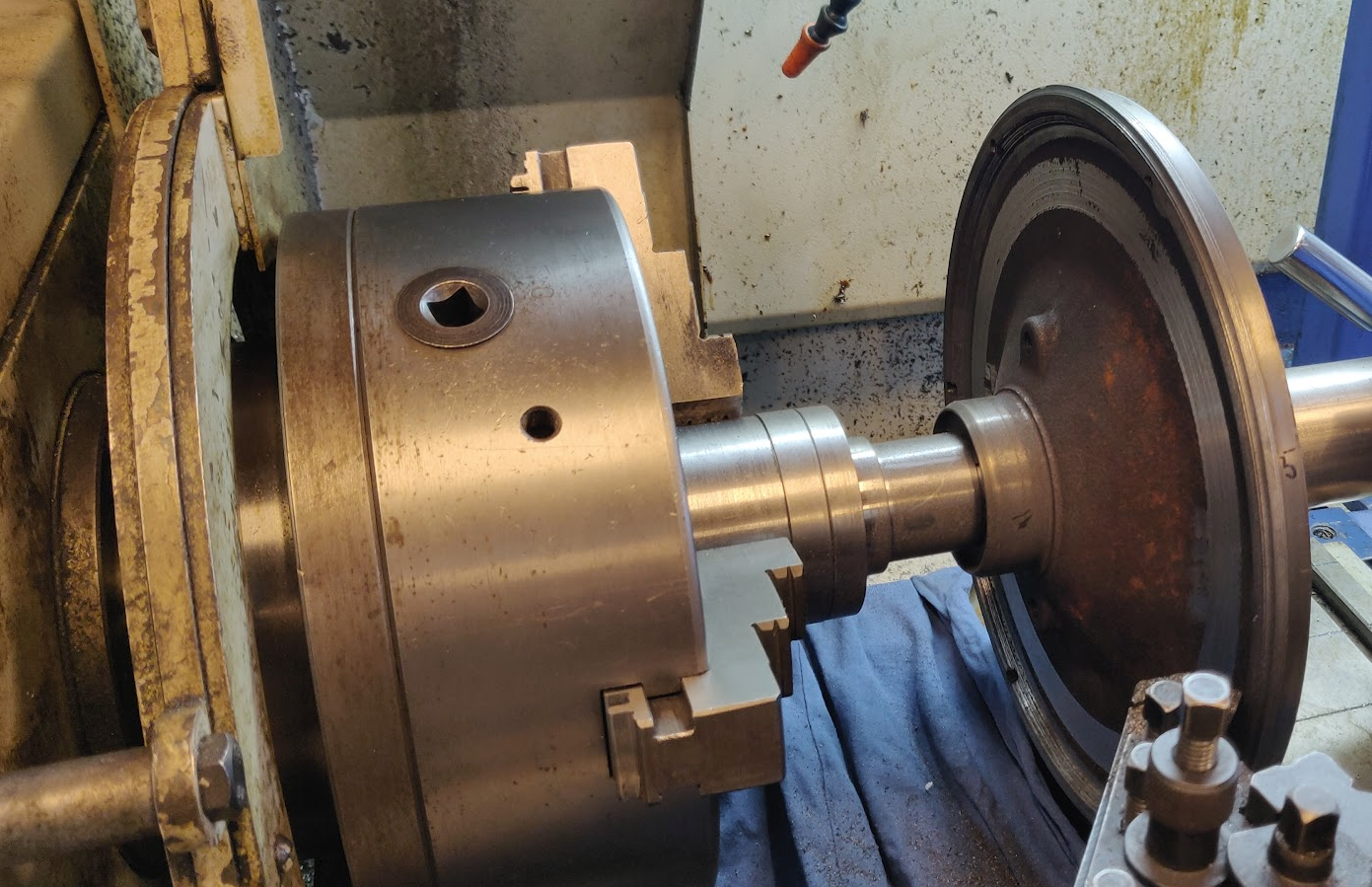 Once there was an axle to attach the flywheel onto, it was time to work on the flywheel. I am guessing the clutch had slipped at some point as the surface of the flywheel was not perfect. it was straightened out on the lathe. Also, it turns out that the flywheel of a wankel engine is not balanced on its own. There is a considerable lump of iron on the other side of the flywheel and the combination of the eccentric shaft and the flywheel is balanced as a set. In order to make use of the flywheel, it needs to be balanced on its own, so the iron lump needed to go. While on the lathe, all the excess material (at least as much as we dared) was removed along with the lump: