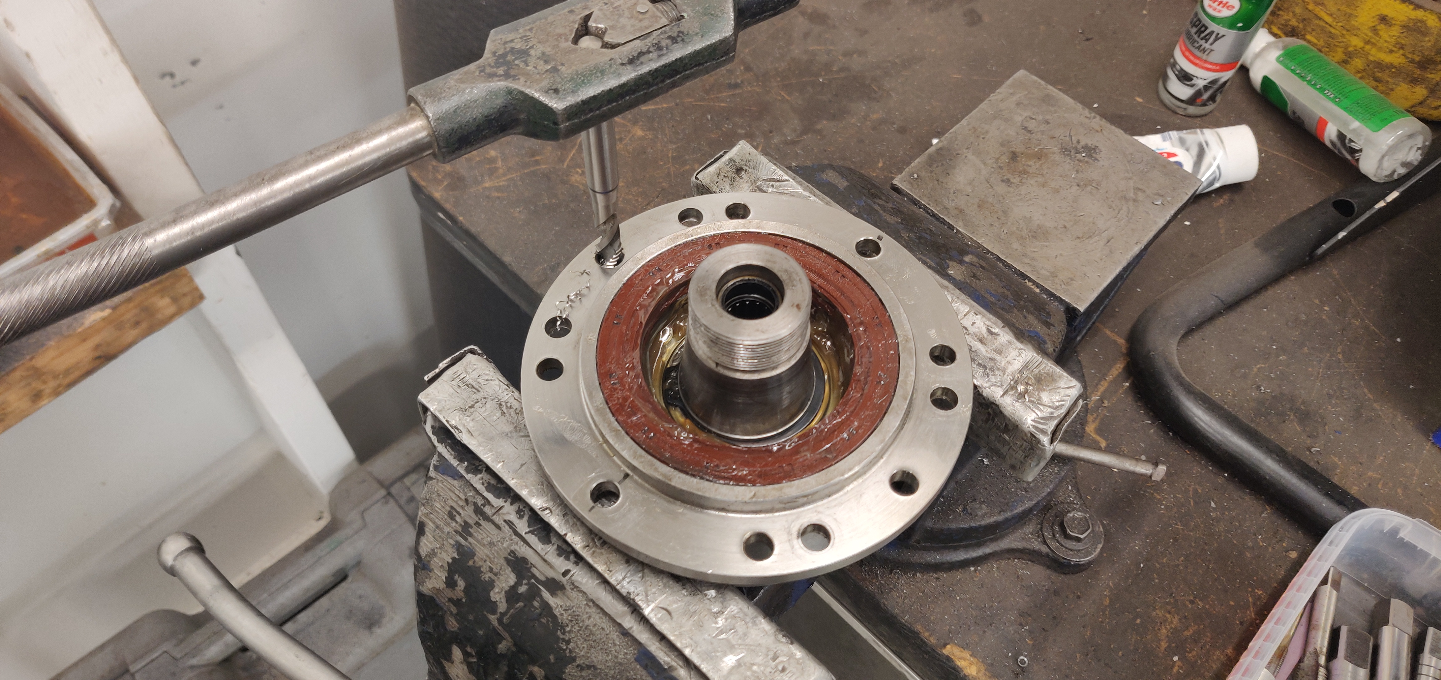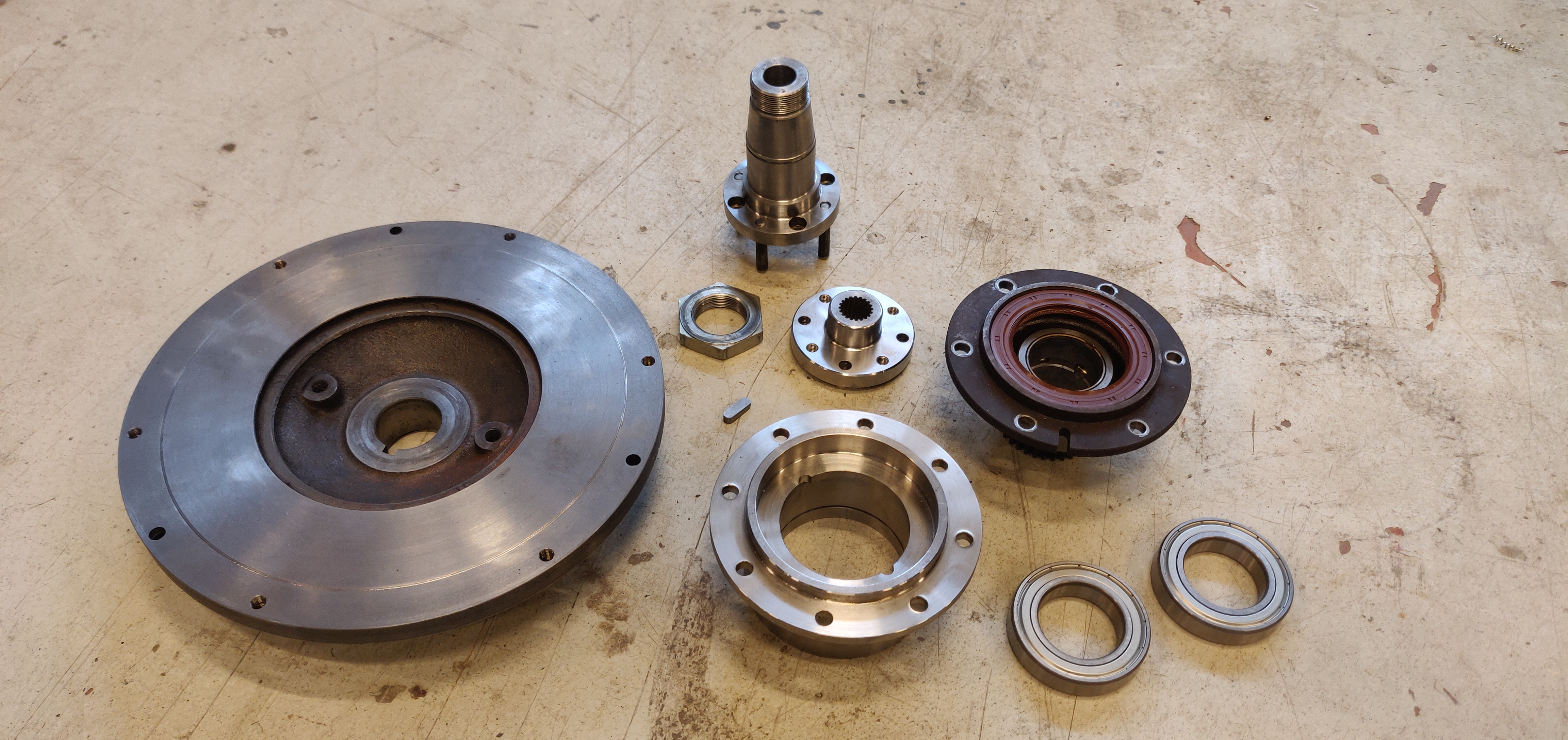 This is why the spline adapter fitment to the bearing axle was made in such a way that in order to attach, prior to the assembly, the spline adapter was kept several hours in the freezer and the bearing axle was heated up in an oven. The actual assembly was done in a hydraulic press.