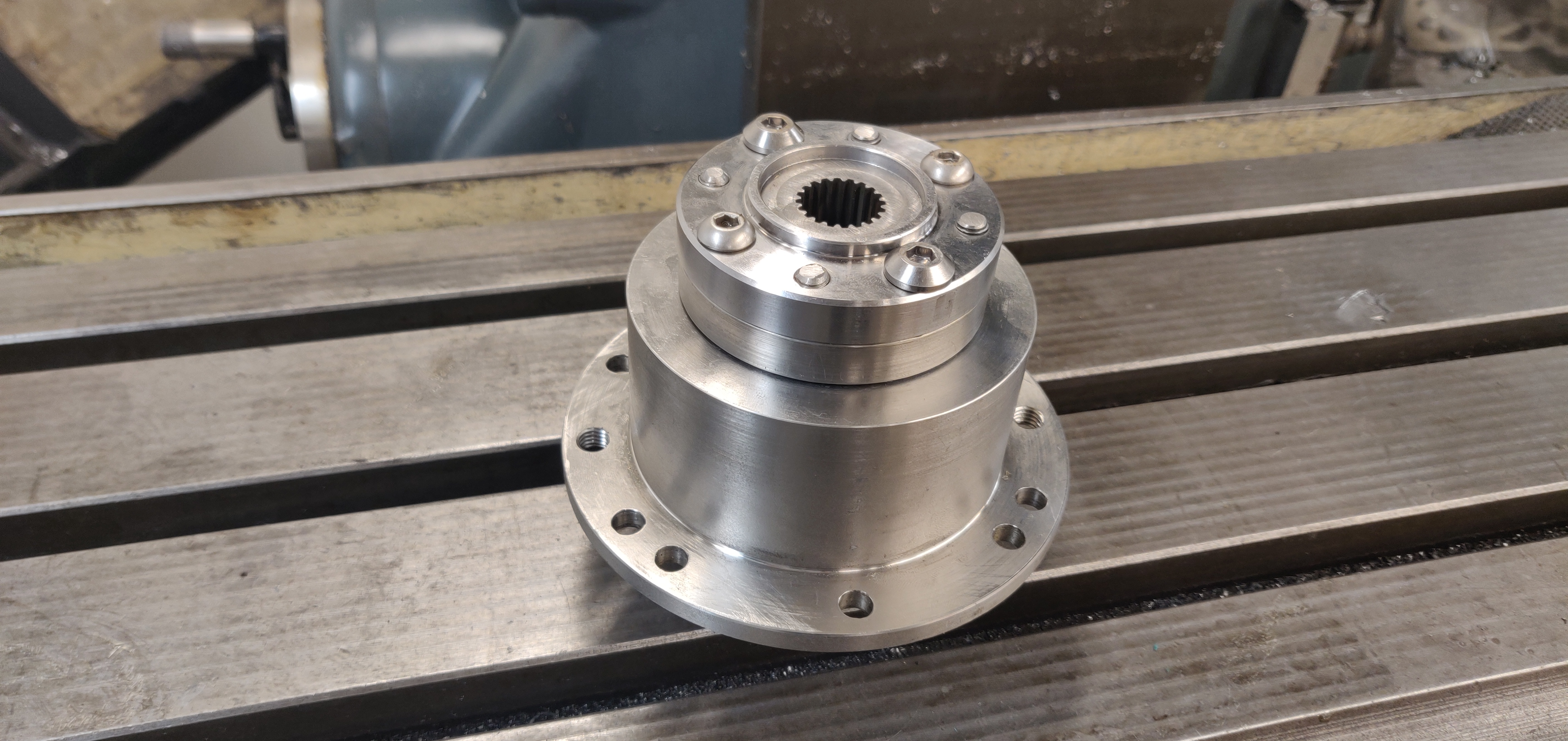 The threads of four of the spline adapter fixing screw holes where actually drilled out and the holes where used for alignment of the other four fixing holes with guiding pins, because after pressing, there would not be any possibility to fix misalignment of the fixing holes.