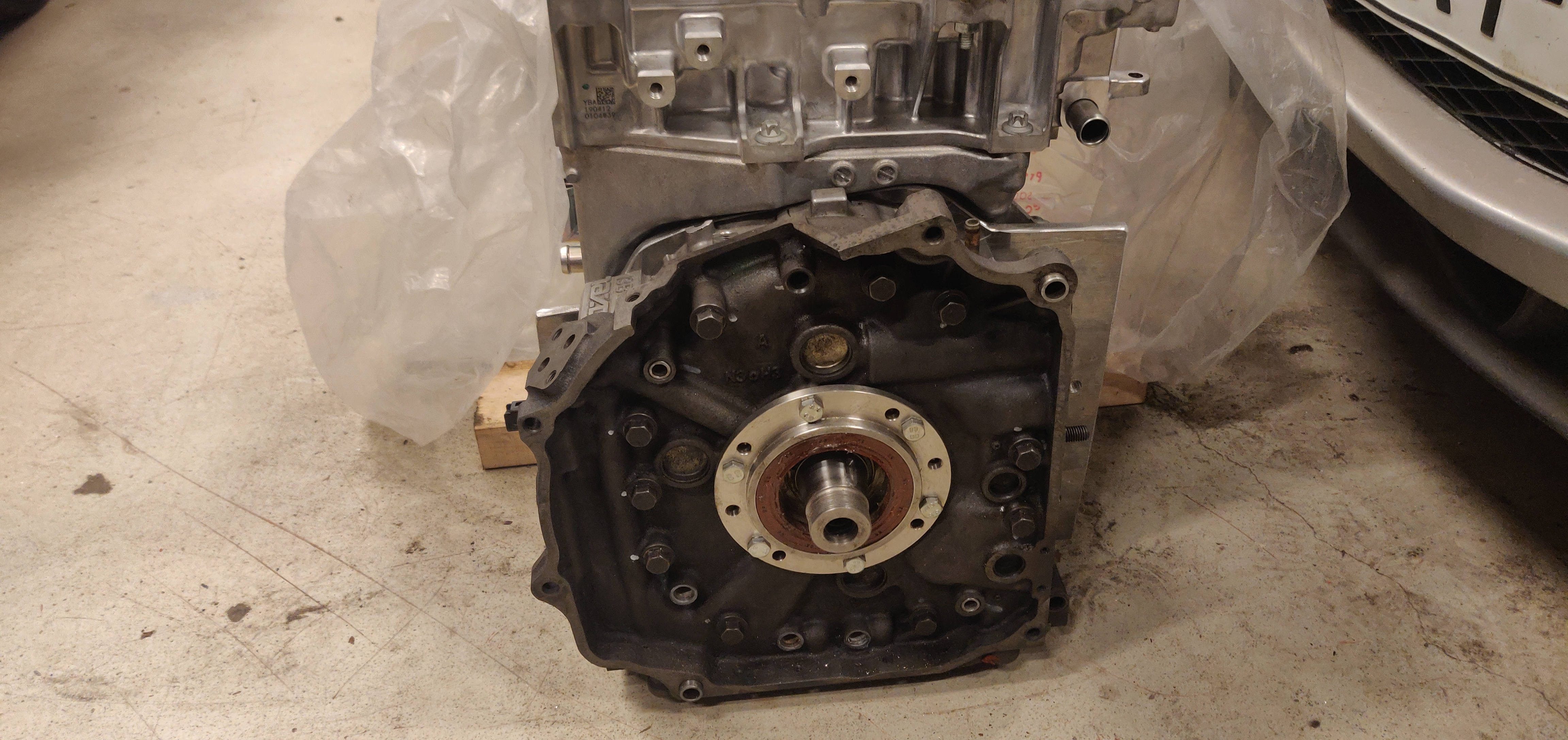 The reused wankel engine block parts attached with the custom bearing housing: