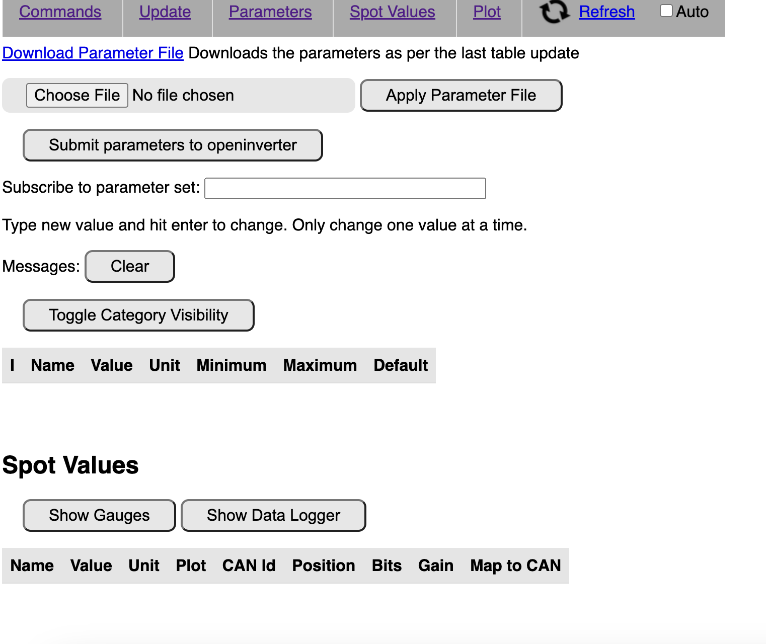 Using a board that Damien built about 4 years ago, I have managed to connect up the inverter to a good 12v source and the WiFi working well. I've updated the files related to the web interface after seeing the UI was spinning and not displaying parameters. However, despite updating the UI, I'm still not seeing parameters show up with the refreshed UI. I've tried uploading a new parameter file and it prints out the parameters, but fails to show them in tabular format. Nor can I save the parameters. If I try downloading my parameters it basically throws back an empty file (besides the curly brackets).