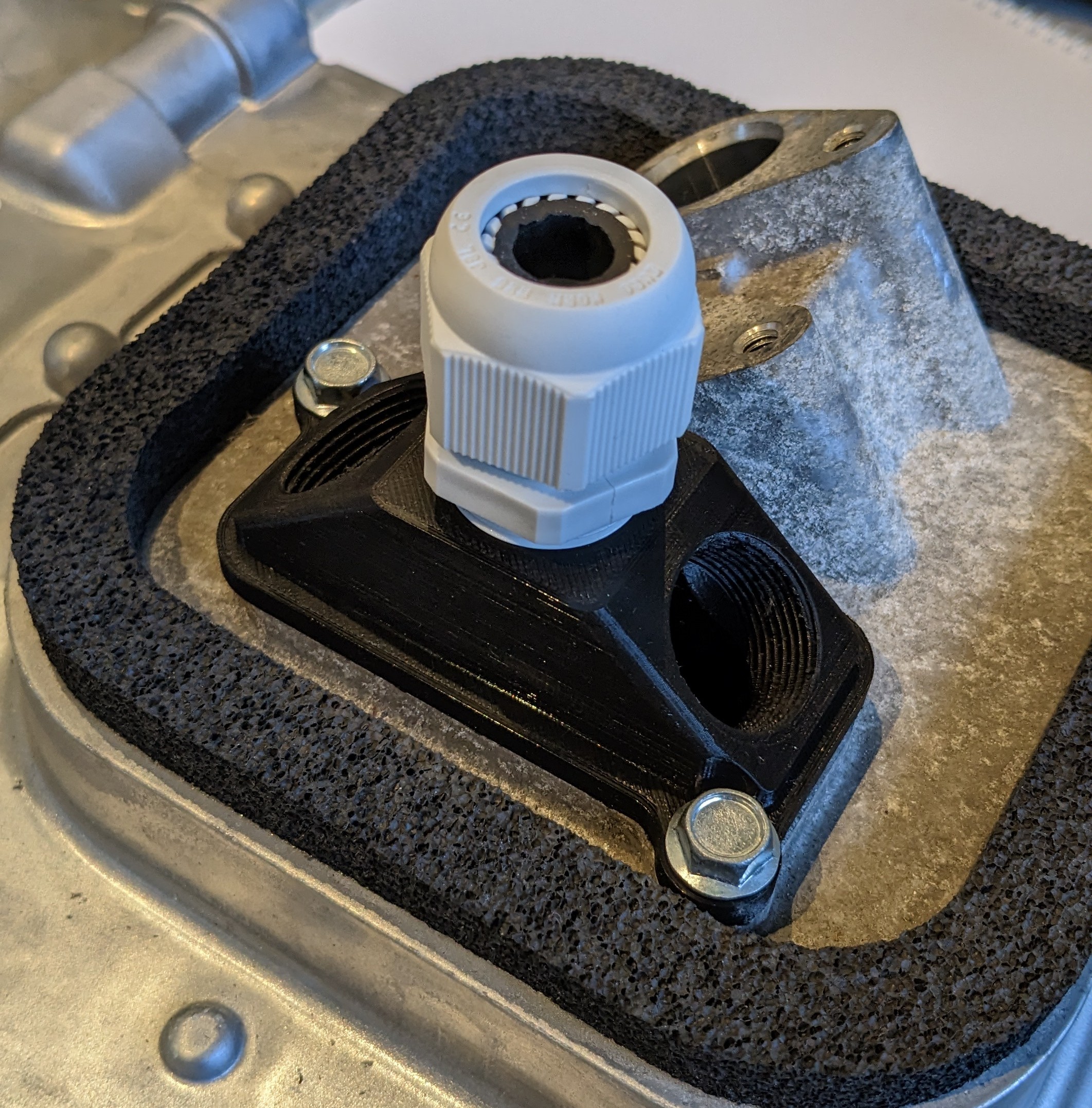 Furthermore I created a version for the flanged Waipu SP21 connector. Inverter/Charger Auxiliary Cable Gland: Printables Link