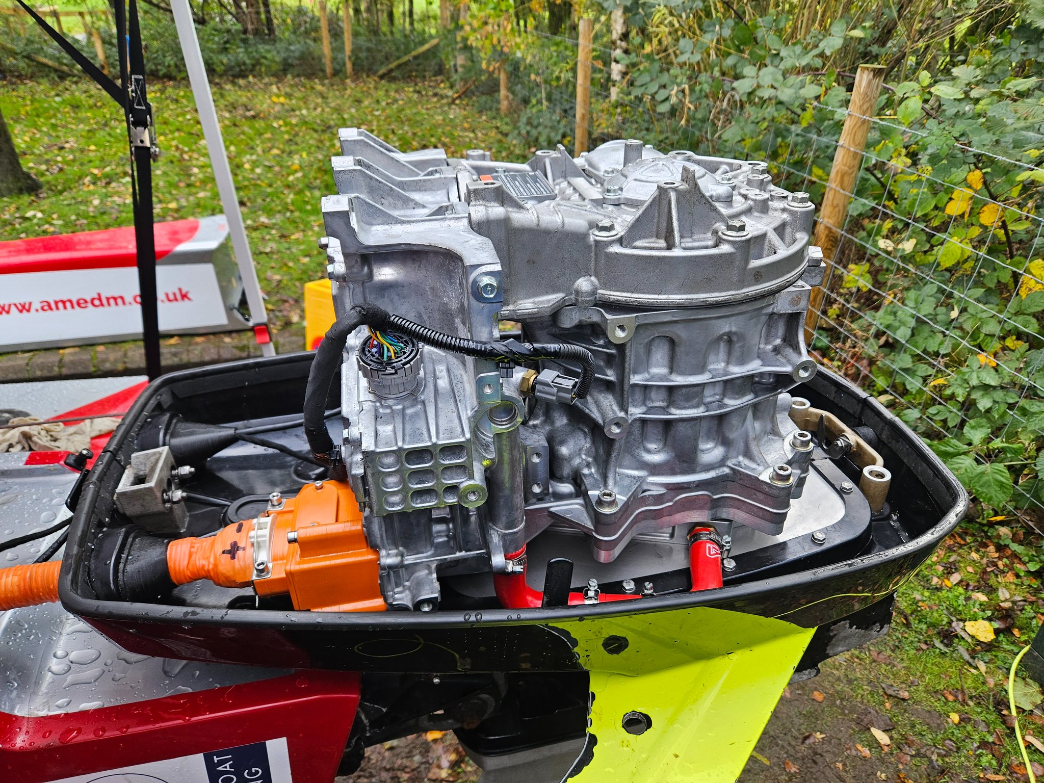 My brothers employer A and M EDM amedm.co.uk took our designs and did the machining work for us resulting in a very neat OEM look to the conversion. We are using the standard tried and tested Mercury Marine race leg to provide the final drive which is essentially a 90deg gearbox with the leaf EM57 on one end and race prop on the other. We use 2 BMW hybrid packs pararalled together, essentially 96s2p. I havnt got any standardised charging figured out yet and would like to go to chademo but in the short term we use 3x 1kw li-ion chargers to 67.2v per hybrid brick off the mains.