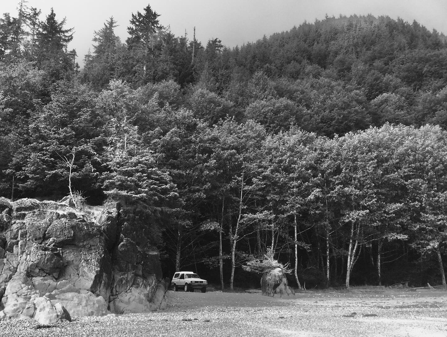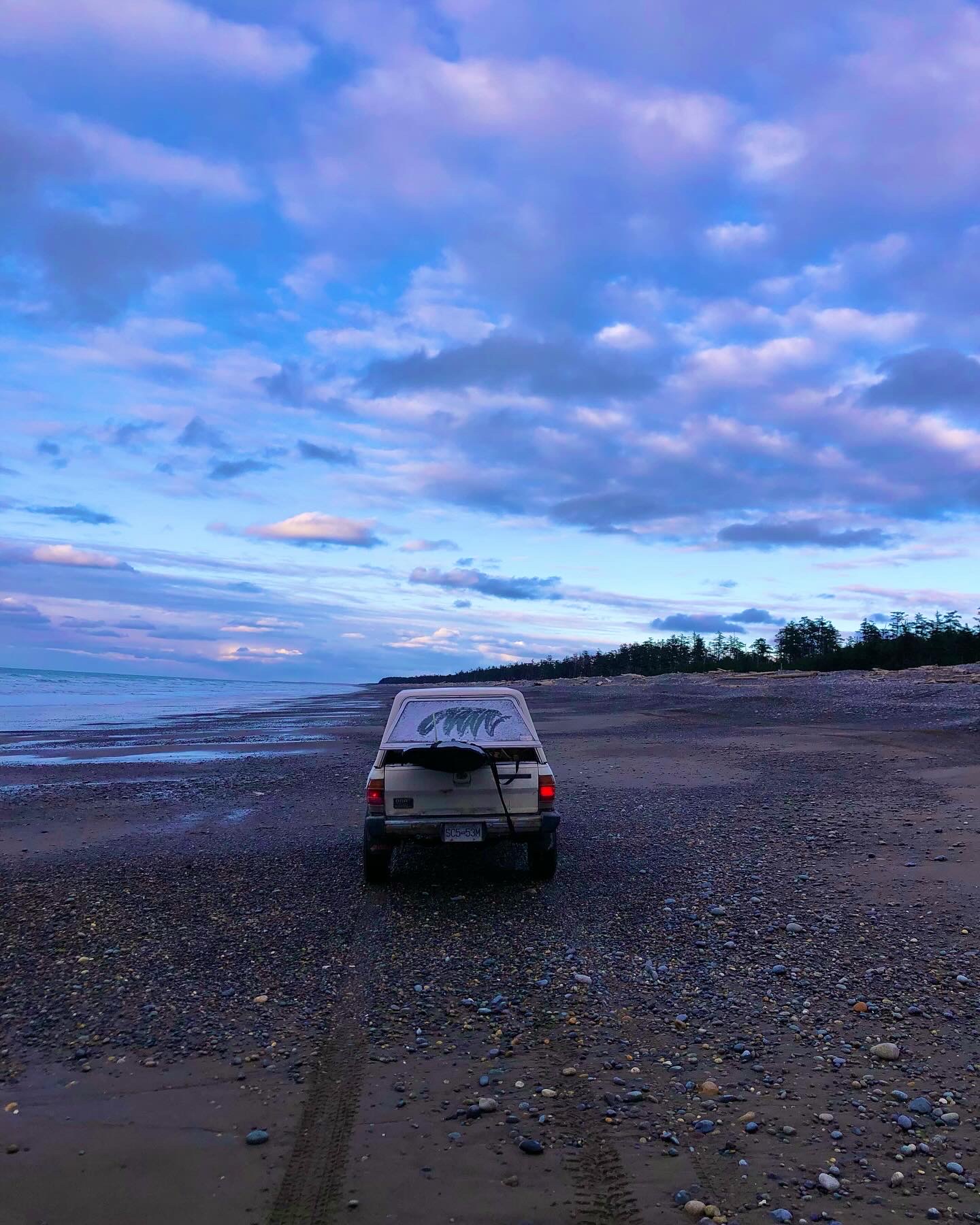 taking a back road detour on the island. before i set off, i was looking at the logging road maps, and it looked like there might be a short cut through a mountain pass that would cut out 40km, but there was 1km of a deactivated road. i gave it a shot...the 1km was washed out and impassable so turned around and charged up again to take the normal rout. by this time it was 1:30 in the morning....next thing i know im driving in a ditch and hit a culvert.... blowing out the front suspension. through friends of friends, budy from a remote town on this side of the coast towed me out and we rebuilt the suspension. back to hooning a day later.