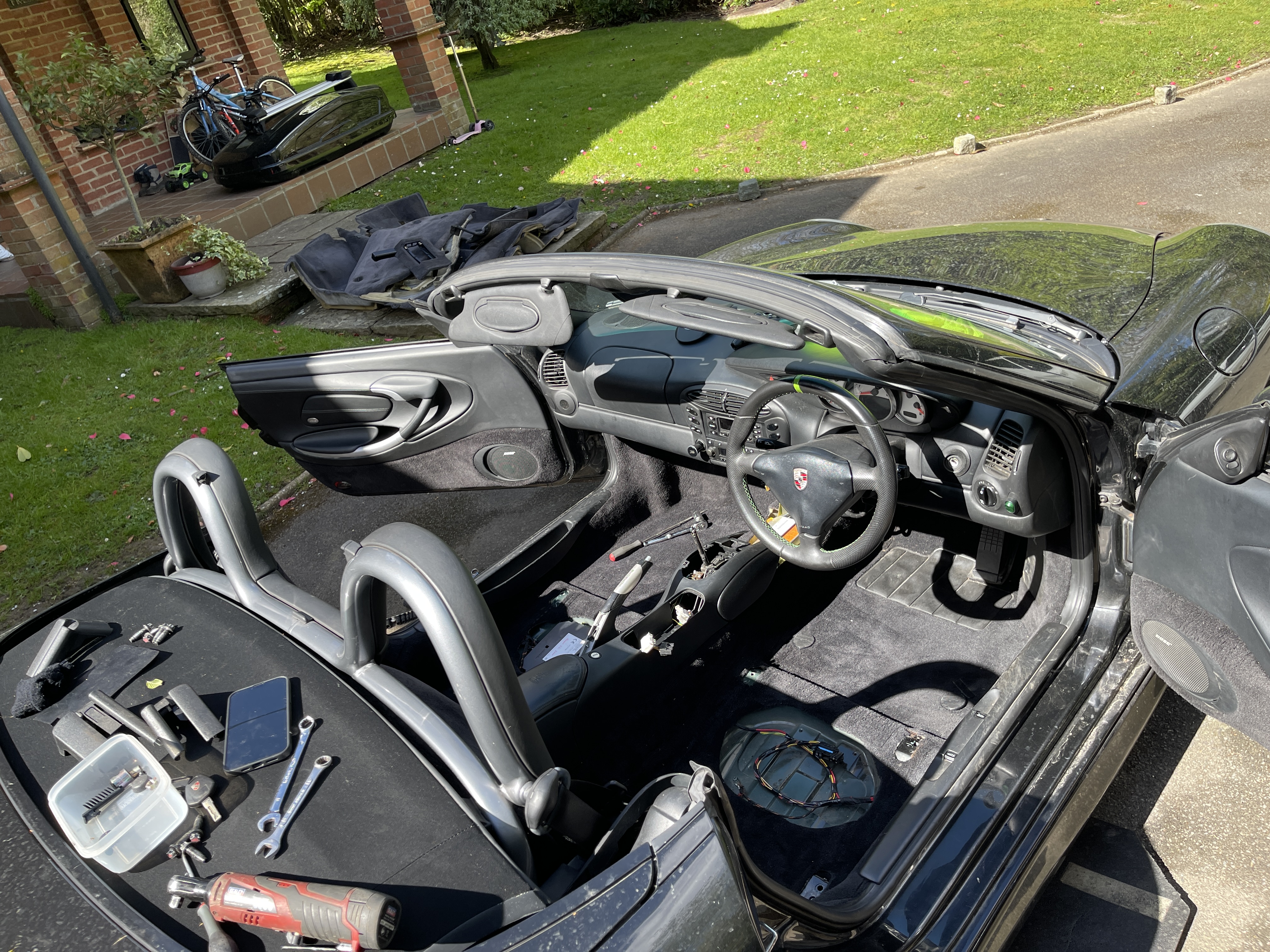 1) There is a perfect size niche towards the rear of the Porsche 996 911 and 986 Boxster tub (RWD cars only) for the Tesla charger to fit, meaning the actual usable space that’s consumed by the charger is small