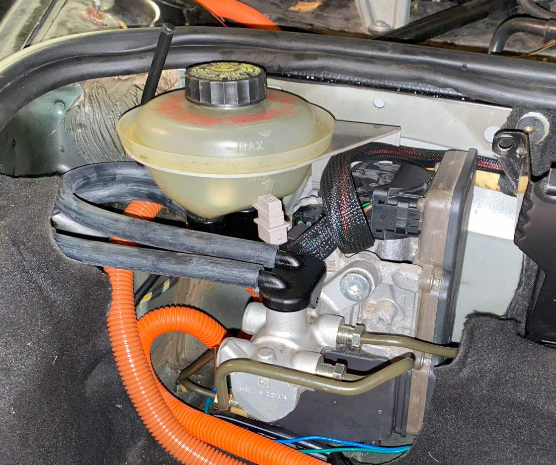 I was never happy with this solution, running hoses from reservoir to cylinder, however it was necessary as neither the Tesla or Porsche reservoir fitted when mounted directly – they were too high fouling the bonnet. Moreover, because the OE brake lines ran in front of the Ibooster the frunk cowling didn’t fit over it and made the whole thing look very ugly: