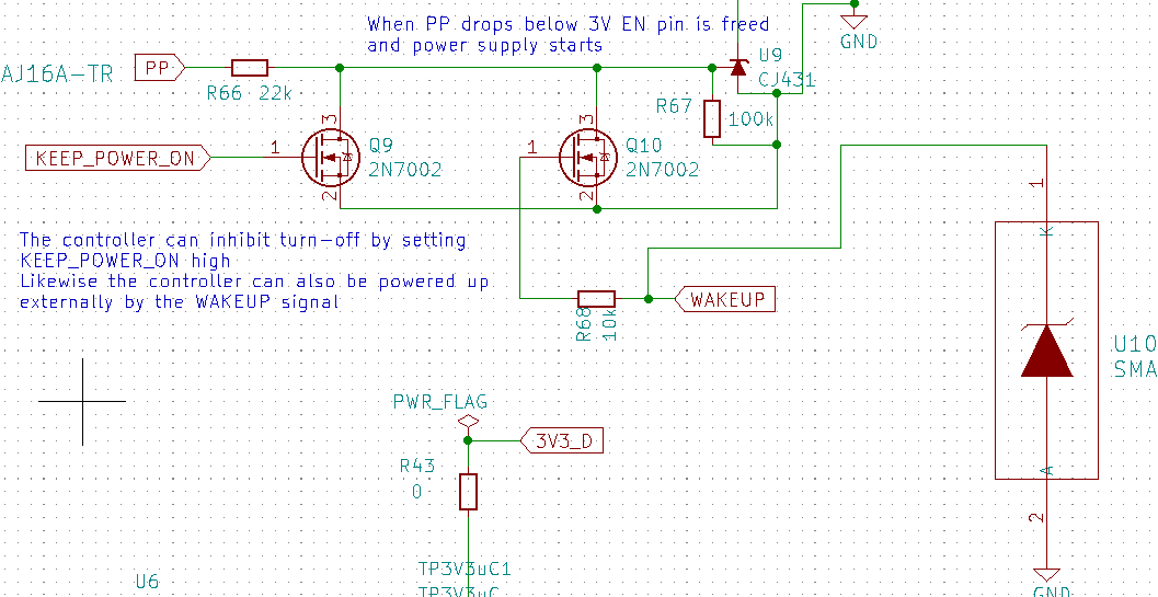 I have added a bidirectional WAKEUP signal to B7. When pulled high it will turn on the 5V reg and thereby the controller. The uC on the other hand can pull high the wakeup signal itself (TRIGGER_WAKEUP) e.g. when woken via PP. The P-MOS isn't particularly strong but wanted to stick with a basic part for now.