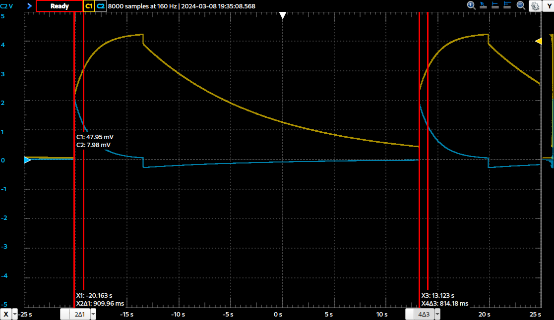 Input is a 5% 1kHz +/-5V square wave that runs for 6.6s and then turns off for 27s