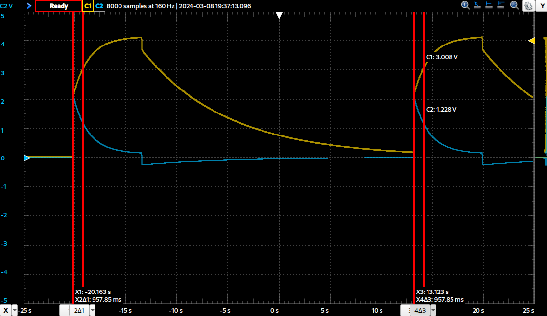 The red point can only discharge, if there is a resistance to ground. E.g. the 10M of the scope input. Then it works. If no resistor is present, there is no path to turn the voltage down. Only leakage current, which is unpredictable. You could disconnect the scope while CP is at 12V, then disconnect CP, wait two minutes and re-connect the scope to the red point. The voltage starts at 12V and ramps down due the 10M of the scope.