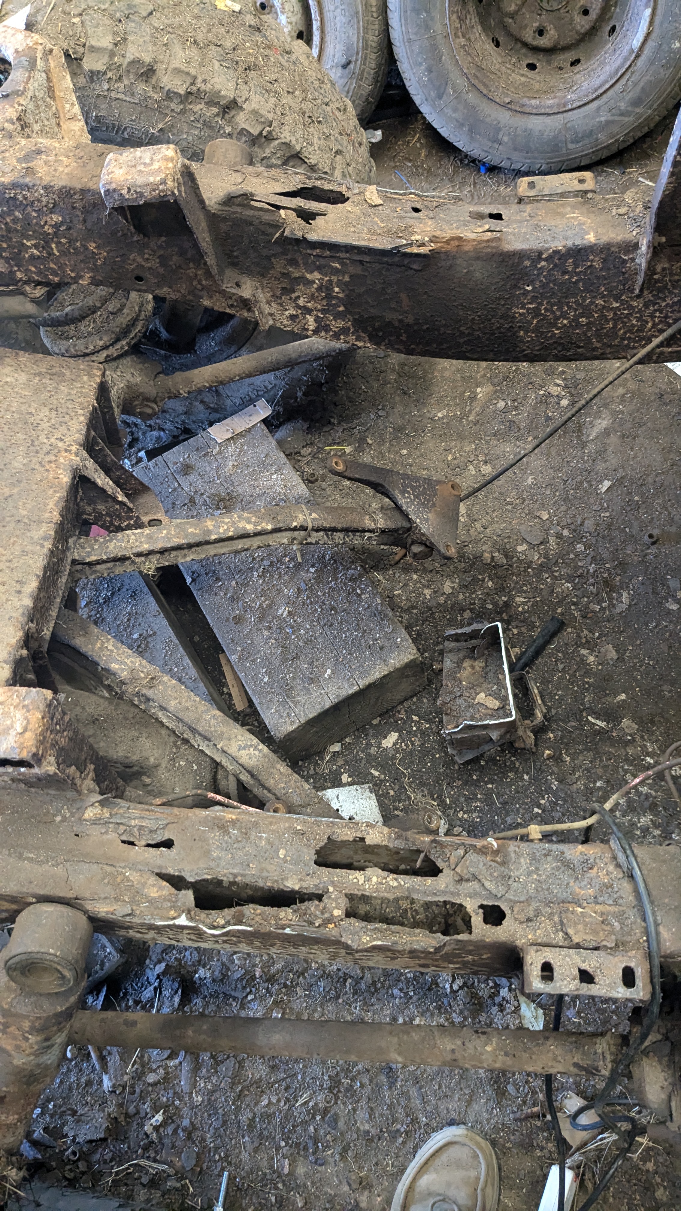 This is the stage where I left in back in 2022, last year I sold the engine and bought chassis repair parts. Now it's covered in the usual farm accumulation. Last year I also made the decision to just skip the ICE swap and convert it to electric.