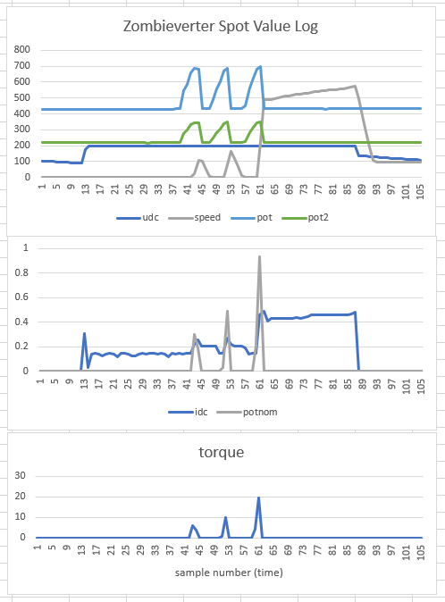 I'm puzzled because I logged potnom during that video, and potnom is clearly zero while the motor speed is increasing. I don't see any logic between here and here which could send a non-zero torque value to the inverter if potnom==0. My only idea is maybe potnom's value is between 0 and 0.0045 and thus being rounded down to zero when displayed?