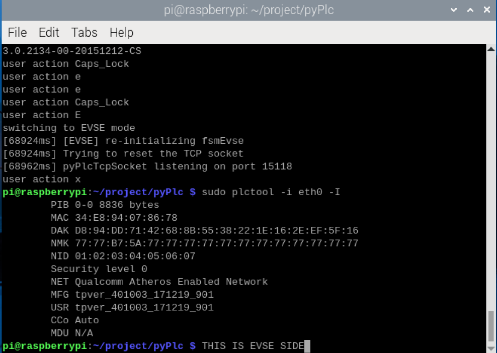 I flash pib again and it shows up EVSE and PEV now. I press the reset long enough to reset. It will show 3 leds light up and I run pyPLC.py E ans P mode on both side will give me following error. And by pressing the reset button. It will reset my the USR from EVSE and PEV to USR tpver_401003_171219_901. And NMK would be different.