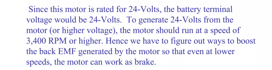 Funny but it seems you clearly lack knowledge of the techniques that allow a BLDC inverter to function as a boost converter to charge the battery even when the EMF is lower than the battery voltage. Here is one technique that utilizes the motor's internal coils to boost the regen voltage: