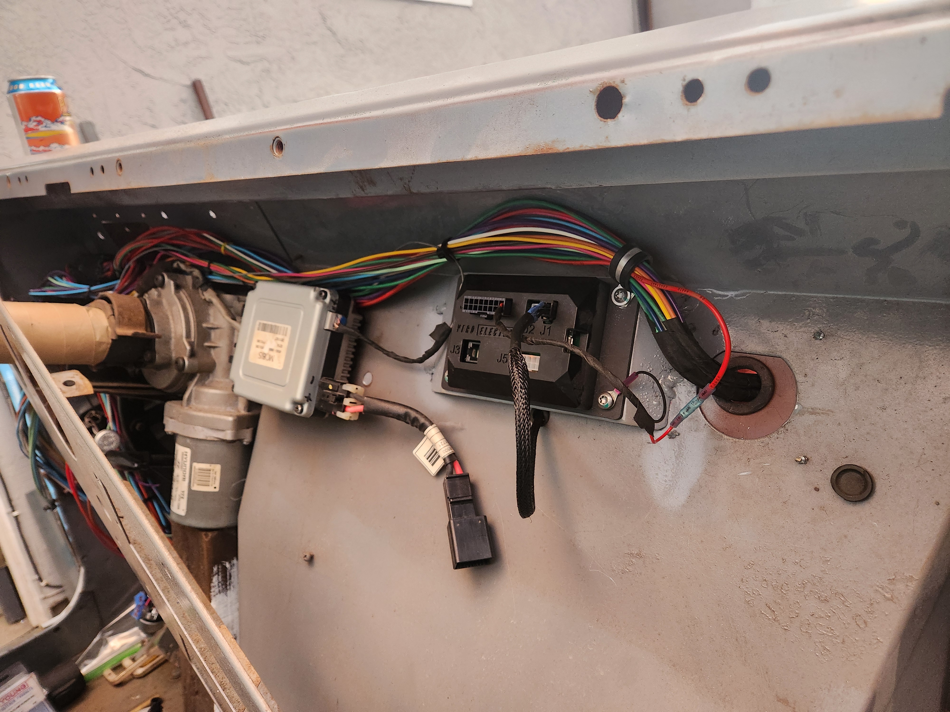 With the engine bay wiring mostly done, moving back now under dashboard. I'm using a VeroBMS (SIMPBMS based) and electing to mount under dashboard. After drilling holes in firewall to mount my steering ECU, I realized it is better to weld mounting brackets than drill so many holes, so made up a bracket and welded into place. Also tidied up the new wiring loom and wired in the steering ECU control line into switched power and BMS into perm 12V.