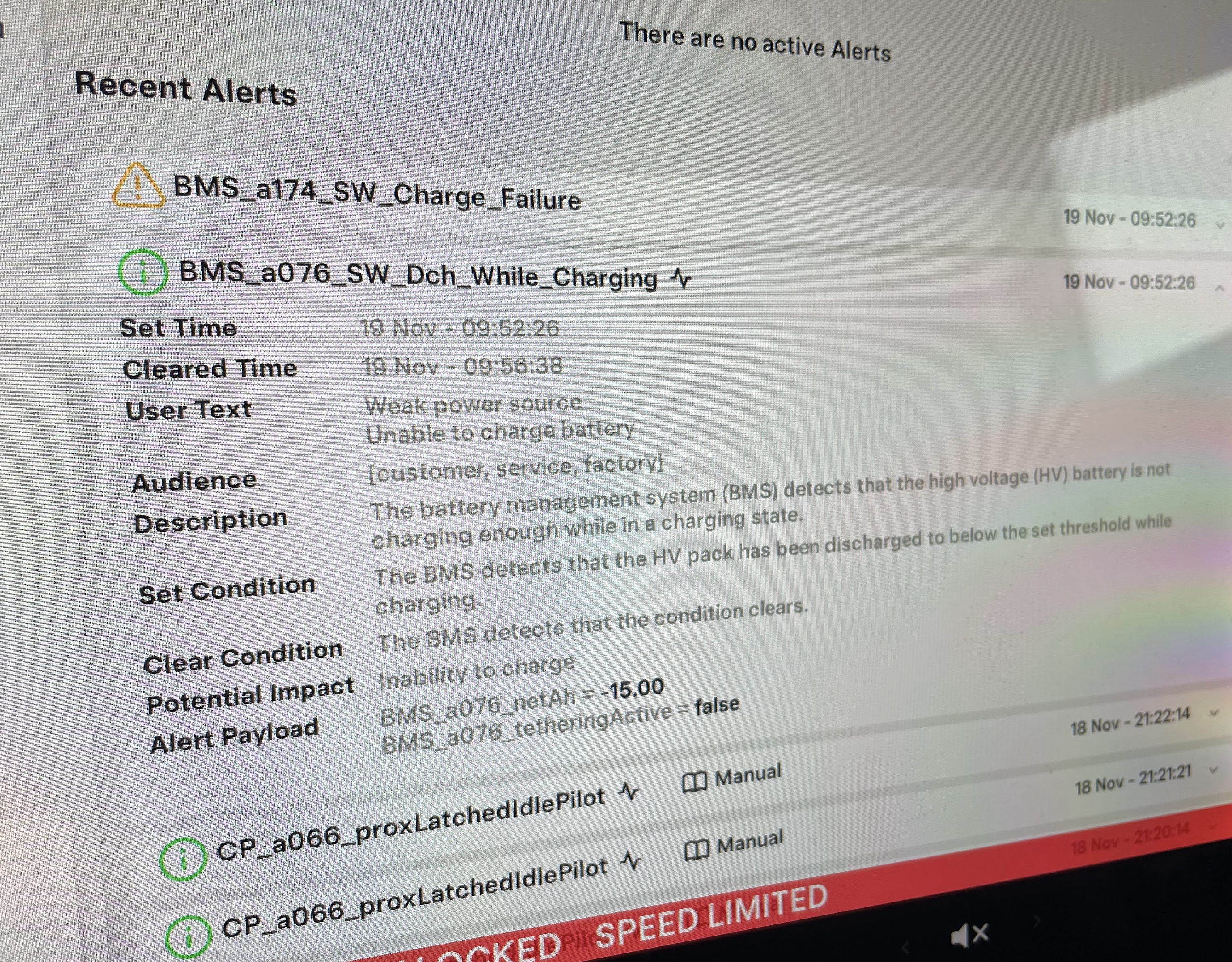 Here the car aborted with the infamous BMS_a076_SW_Dch_While_Charging, but interestingly enough without payload (it doesn't mention -15Ah):