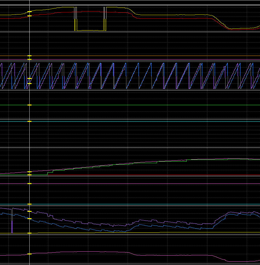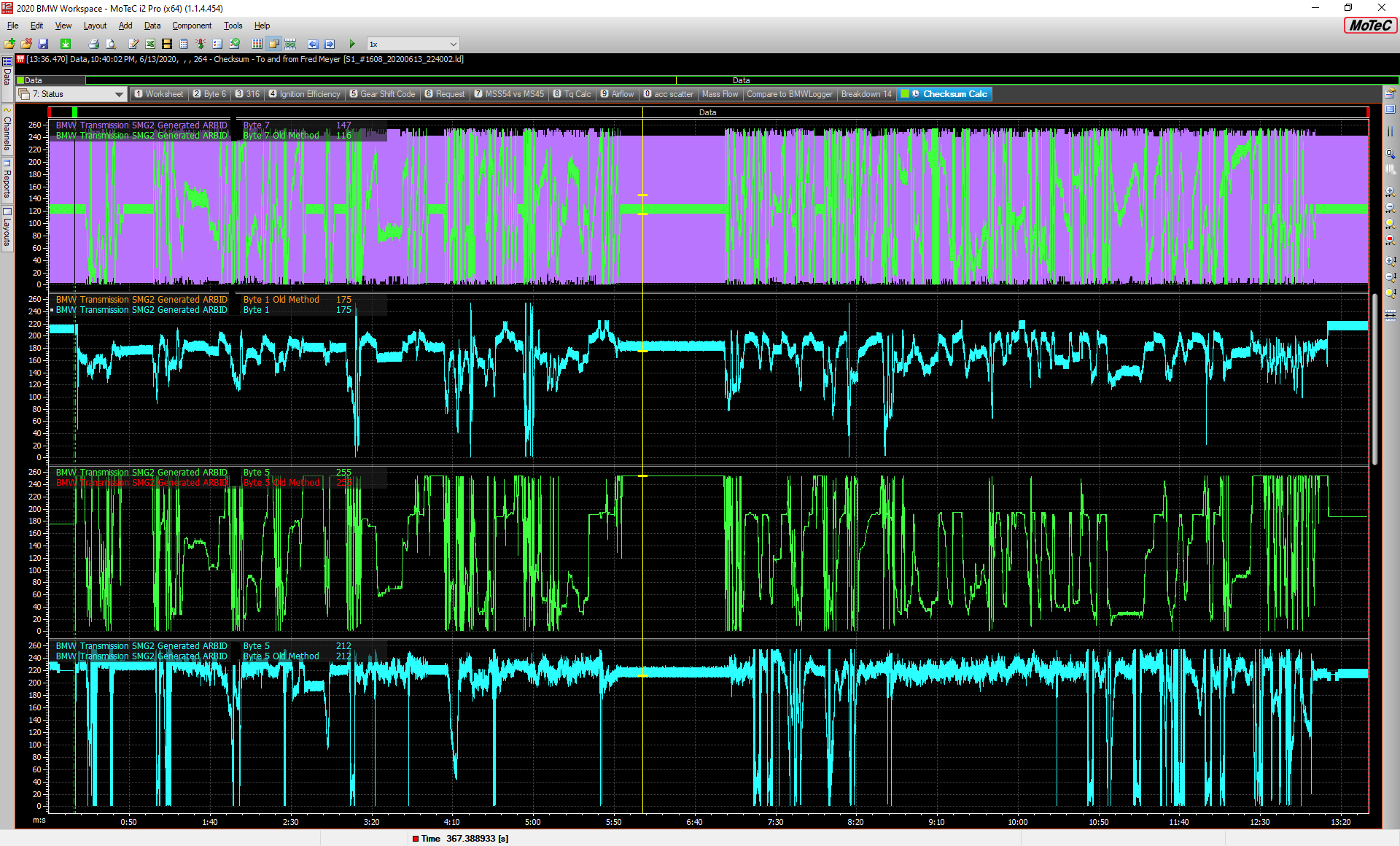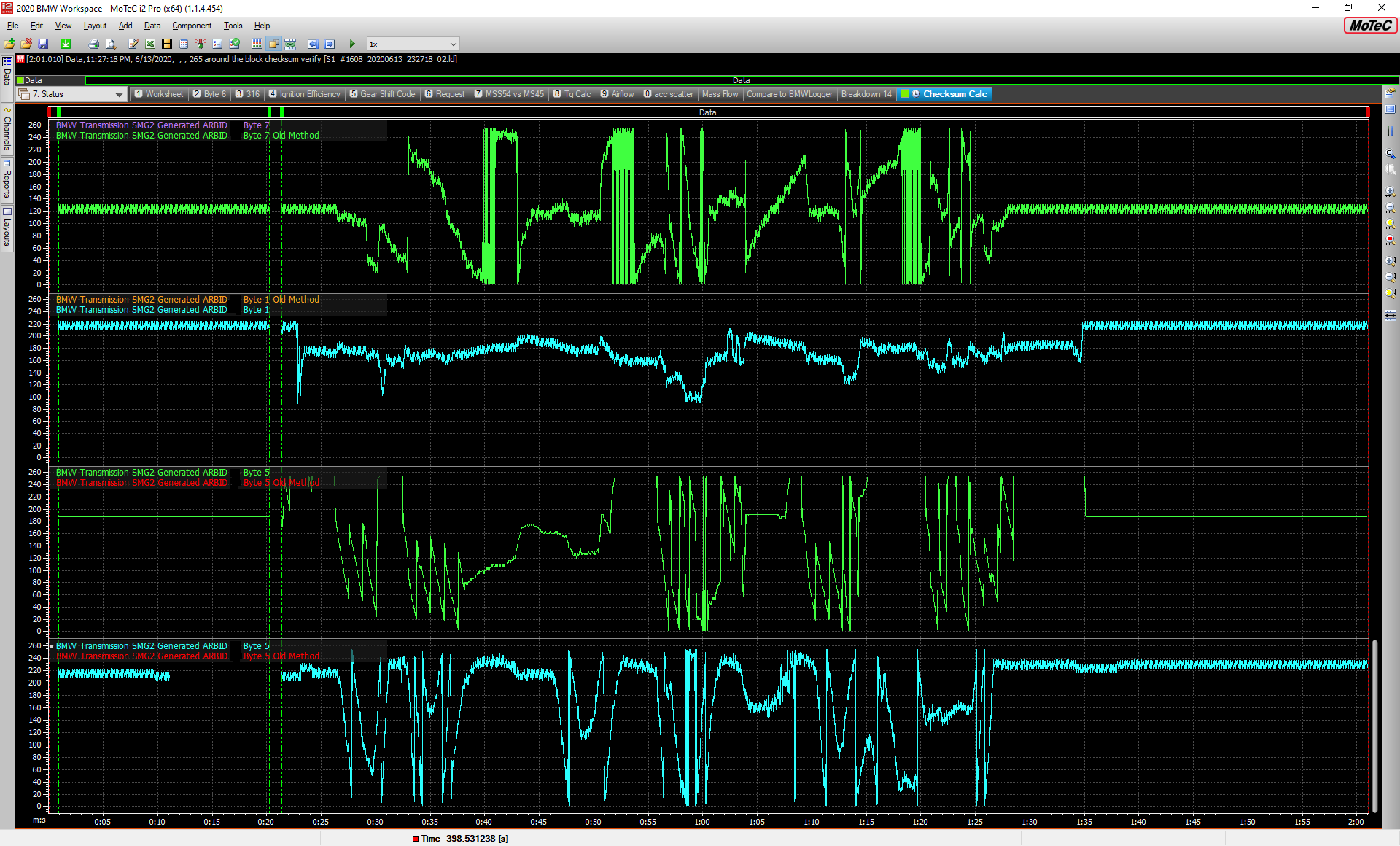 However as you can see between the green and pink data 6 items down, my data (green) is not nearly as smooth. This happens to be wheelspeed data, which is at a odd cadence - 7.5 ms on the BMW platform. Everything in the Motec is on a 1/5/10/20/50/100 ms cadence. So I have it polling at 10 ms. Clearly I need to change that to 1ms and allow it to fall out of there 'Have I received anything' block for a majority of the time. Hopefully that doesn't eat up too much CPU.